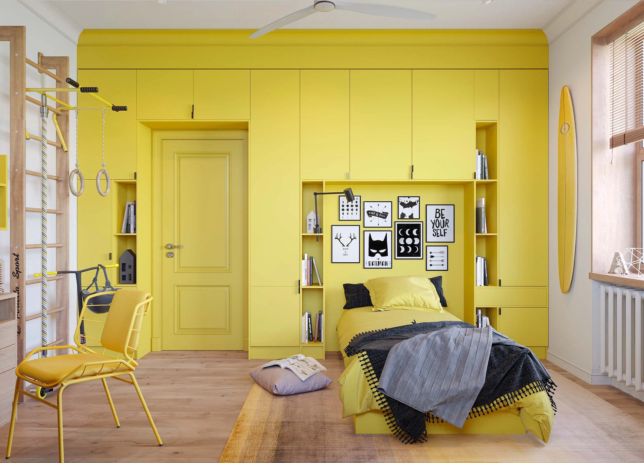 Радостный желтый цвет придает помещению теплоту и уют. Эффективно стимулирует мозговую деятельность, но при переизбытке способен вызывать усталость.