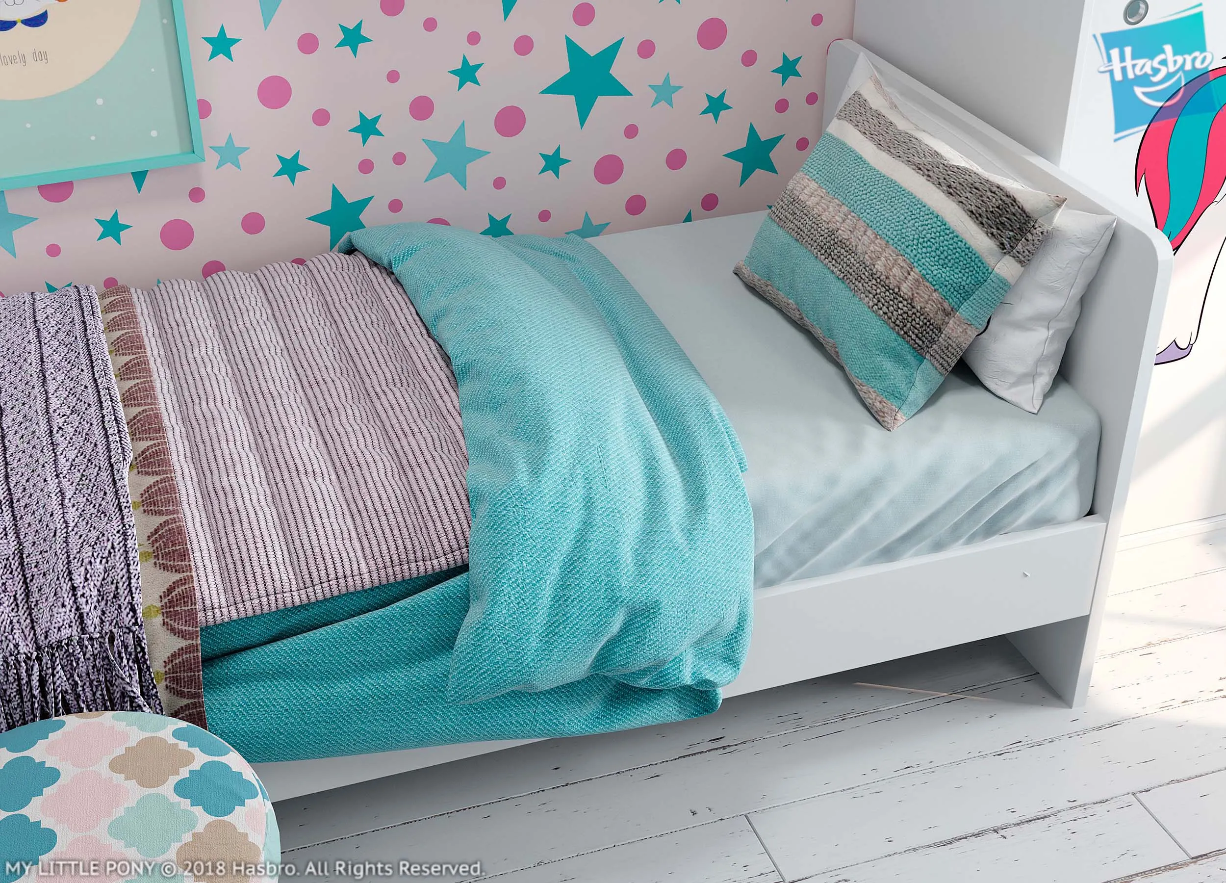 Особое внимание в спальне девочки стоит уделить текстилю. Красивые портьеры и легкий полупрозрачный тюль на окнах, мягкий плед и разноцветные подушечки на кровати, а также длинноворсовый ковер на полу – прекрасно дополнят внешний вид.