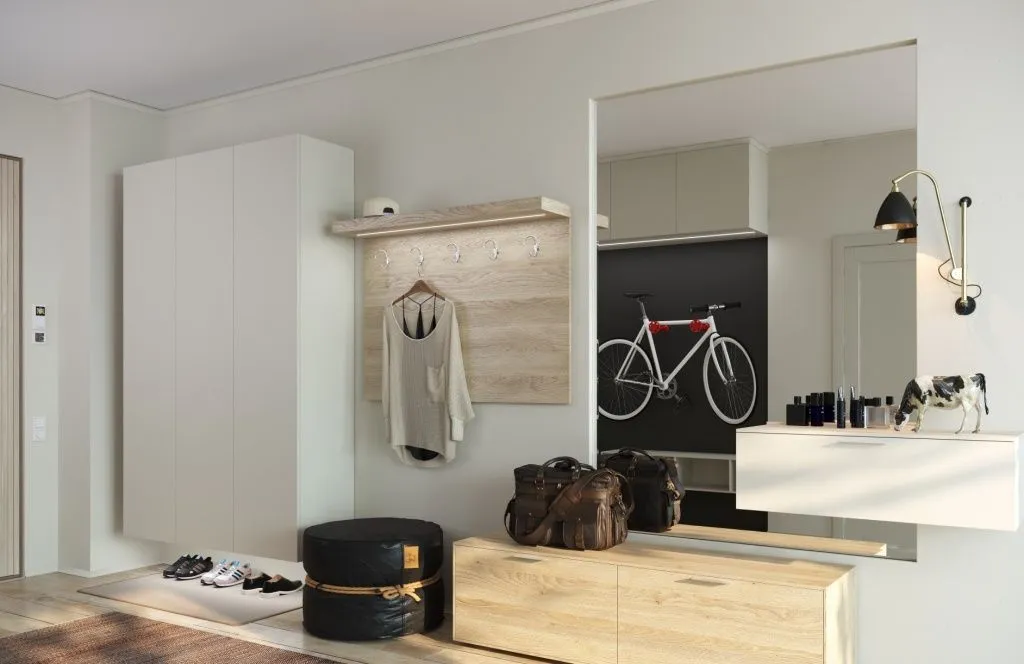 Кроме того, для встроенных вариантов можно выбрать практически любое внутреннее наполнение. Фото дизайна внутри шкафов вы можете увидеть в нашей подборке. Любые конфигурации изделий легко дополнить необходимыми внутренними секциями и приспособить для нужд конкретного человека или семьи. Например, можно предусмотреть место для выдвигающейся гладильной доски или отдельный отсек с креплением для велосипеда.