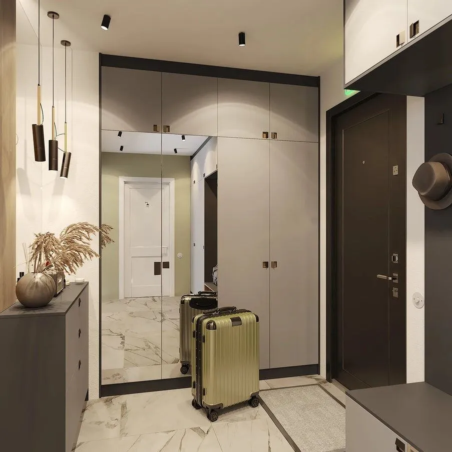 Шкафы в прихожую должны сочетать в себе компактность и функциональность, ведь обычно эти помещения в наших домах отличаются очень скромной площадью. В данном случае хорошо подойдут узкие и высокие варианты-купе, которые могут одновременно служить и гардеробом, и обувницей. А антресоли подойдут для хранения редко используемых вещей. Такое решение поможет убрать вещи с открытых вешалок и придать прихожей опрятный вид.