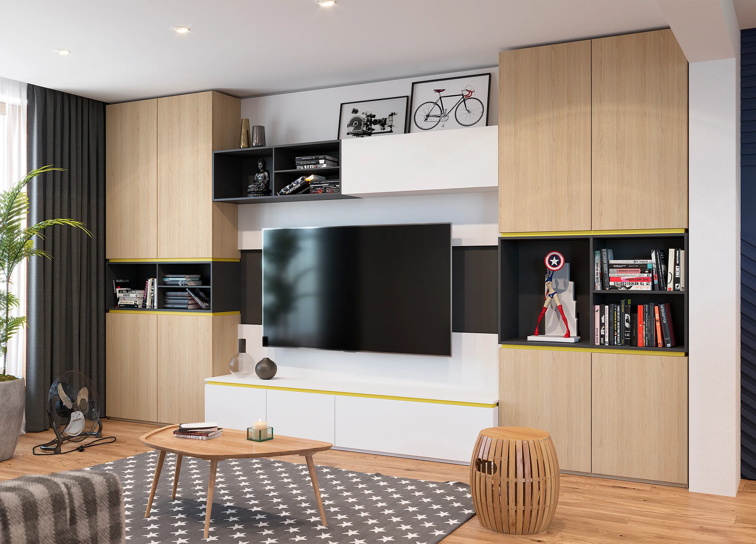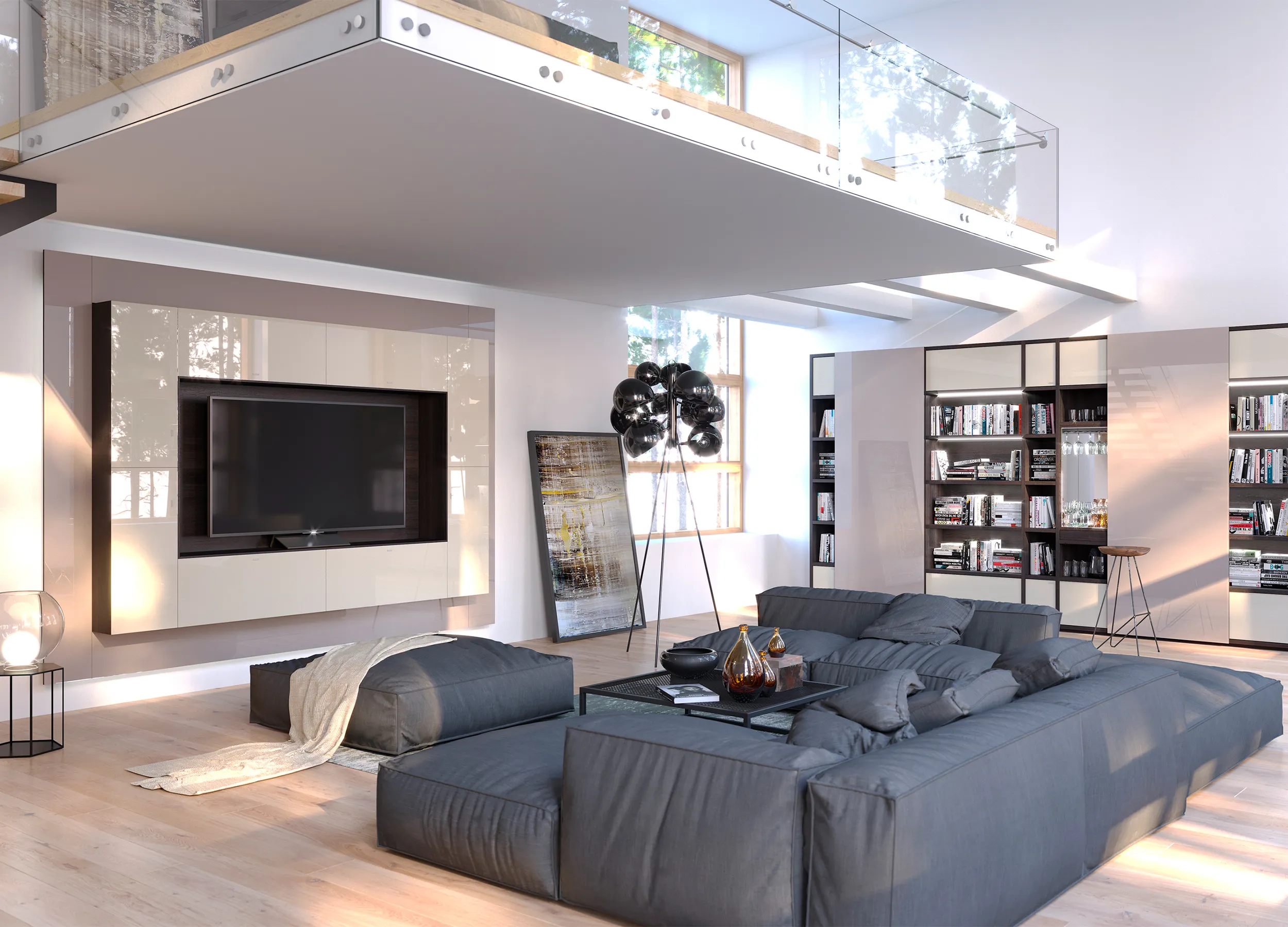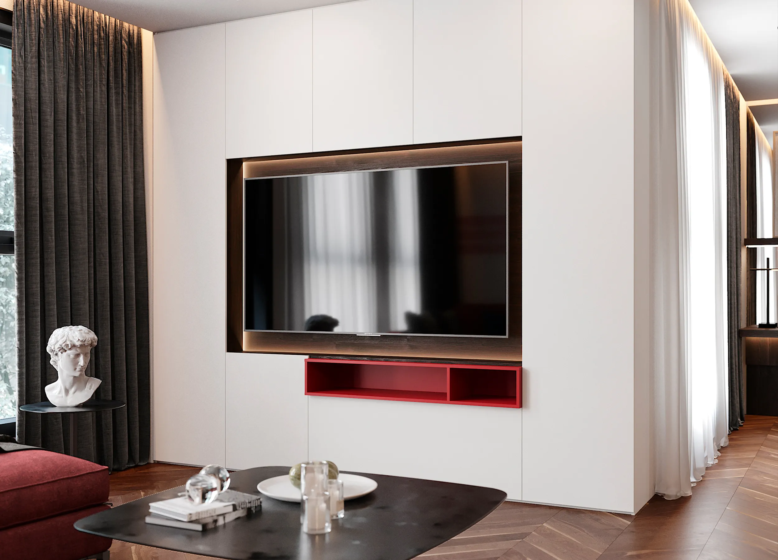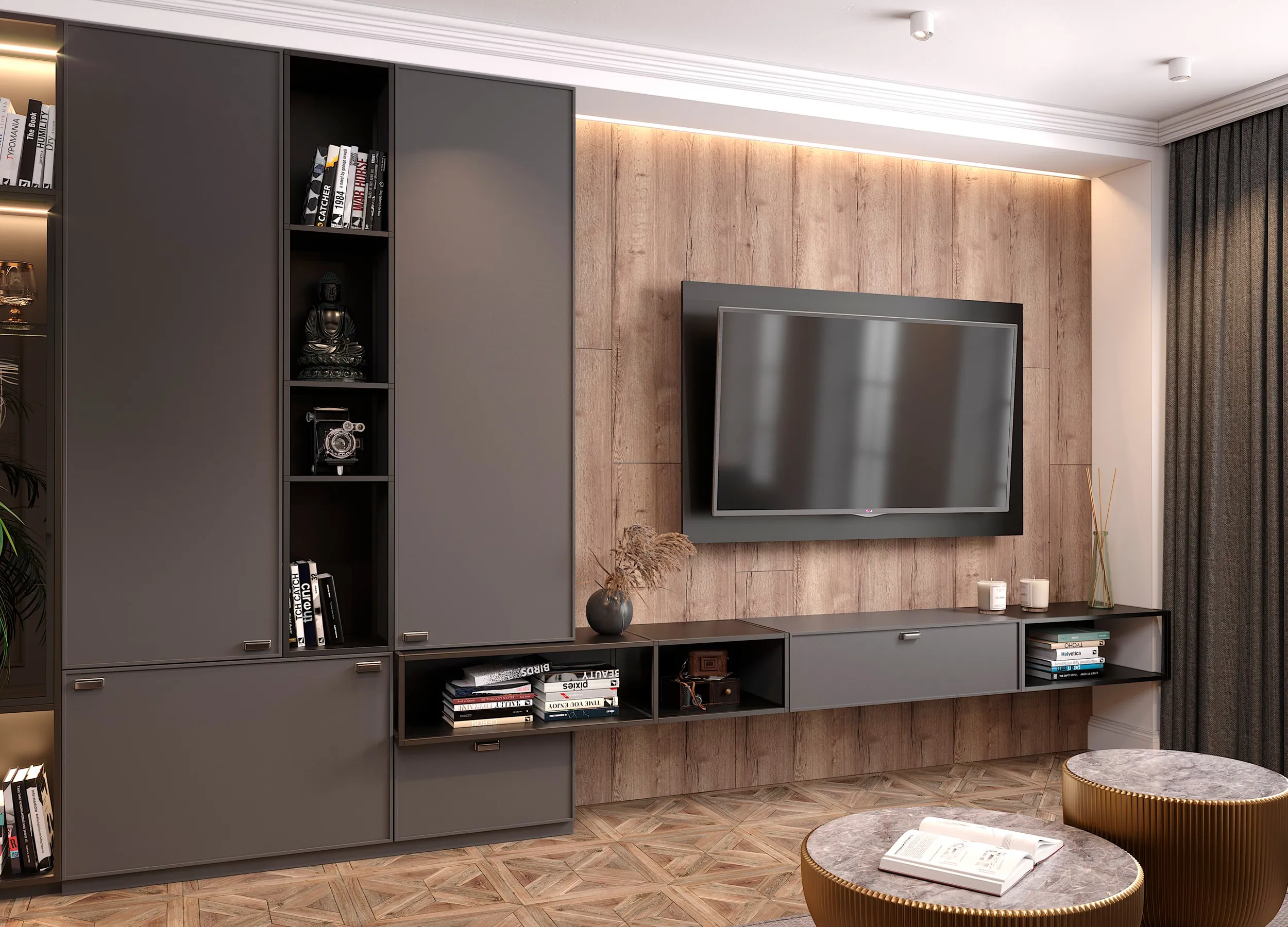 Даже для тех, у кого гостиная ― не единственная комната квартиры, она выполняет множество задач, служит и кабинетом, и столовой, и кинозалом, а часто и спальней. Шкафы в современном стиле не только позволяют поддерживать порядок, но и значительно расширяют возможности комнаты, грамотно организовывая пространство.