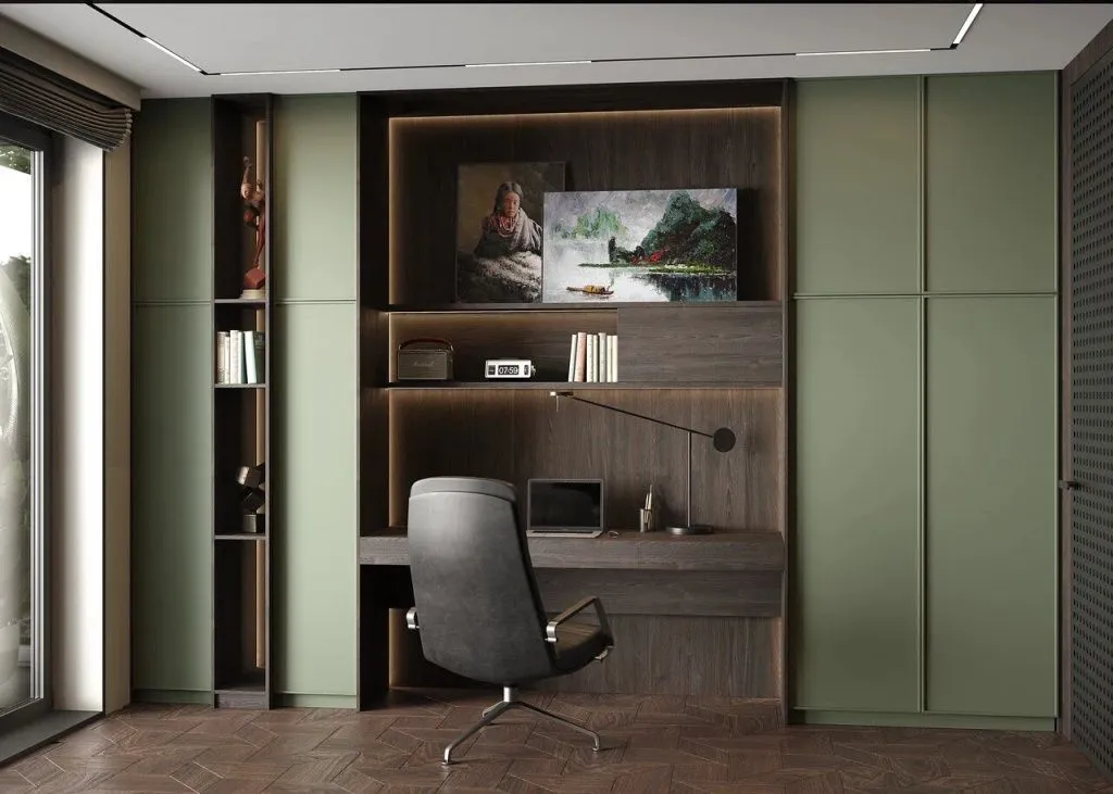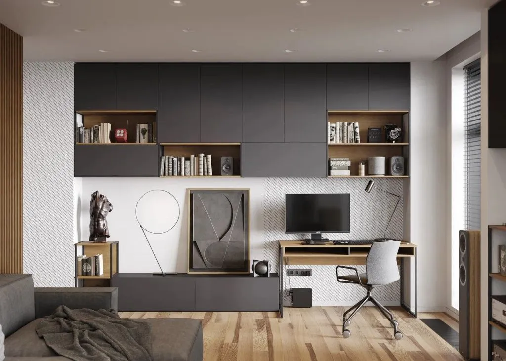 Планировка зависит от того, для каких целей предназначено помещение. В гостиной обычно выделяют зону для семейного отдыха и рабочий уголок. Не во всех современных квартирах можно оборудовать отдельный кабинет, поэтому письменный или компьютерный стол часто устанавливают в гостиной. Он должен располагаться у окна. Эту зону можно отделить с помощью стеллажа или подиума.