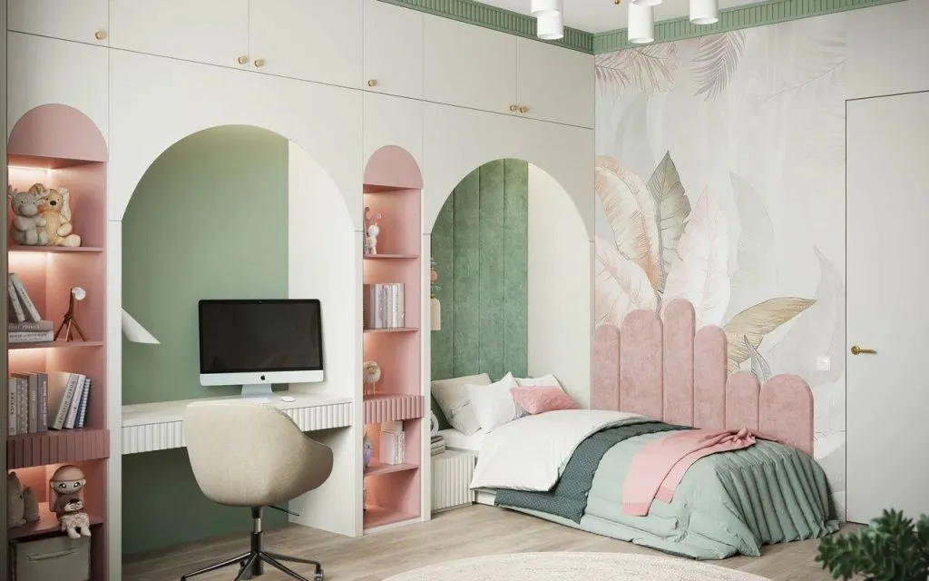 Спальня-детская. Такой вариант обычно используют семьи, в которых есть маленькие дети. Чтобы малыш всегда был под присмотром, в первые годы жизни кроватку часто устанавливают в спальне родителей. Перегородки в этом случае неуместны. Пространство для малыша можно отделить с помощью мягкого ковра или цветных обоев.