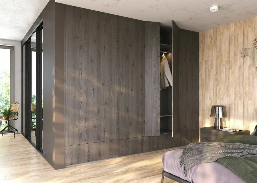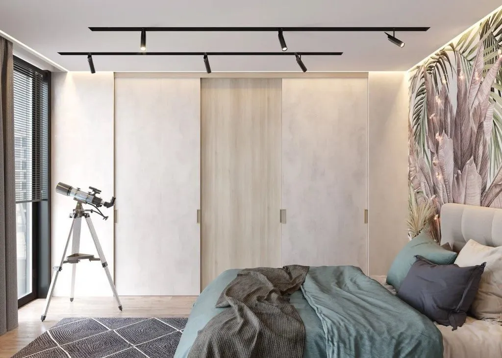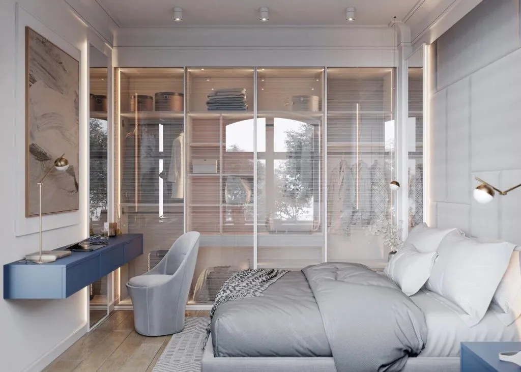В спальне размещают кровать и гардеробную. Если в квартире живет семейная пара, дополнительно можно установить две прикроватные тумбы и туалетный столик. В случае, если свободного места недостаточно, столешницу можно разместить на подоконнике.