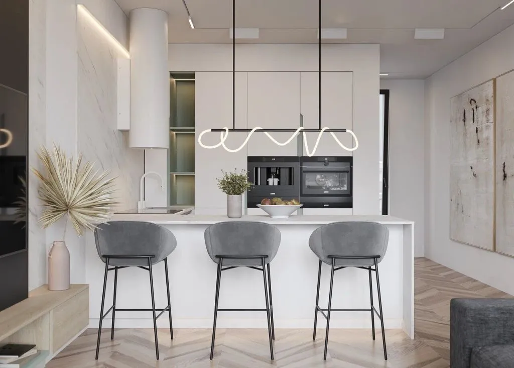Предметы обстановки можно расположить вдоль одной стены (как правило, с той стороны, где находится стояк). Кухонный гарнитур с барной стойкой можно использовать для зонирования.