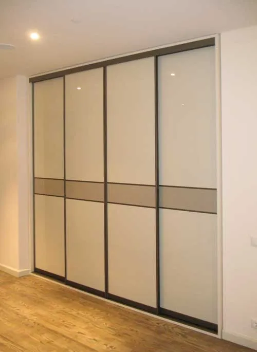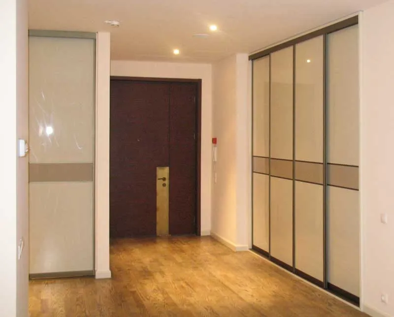 Встроенный в нишу шкаф-купе. Фасад выполнен с применением дверей-купе серии "Нотеборн А", комбинированные вставки в дверях - высокоглянцевая эмаль "Шабли" и "Джут".