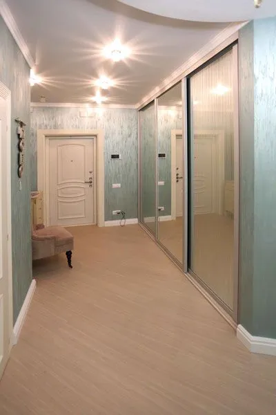Вместительный встроенный шкаф-купе. Раздвижные зеркальные двери в широких алюминиевых рамах "Нотеборн 55". Зеркальные полотна двух видов - "Серебряное" и "Рейн Серебряное".