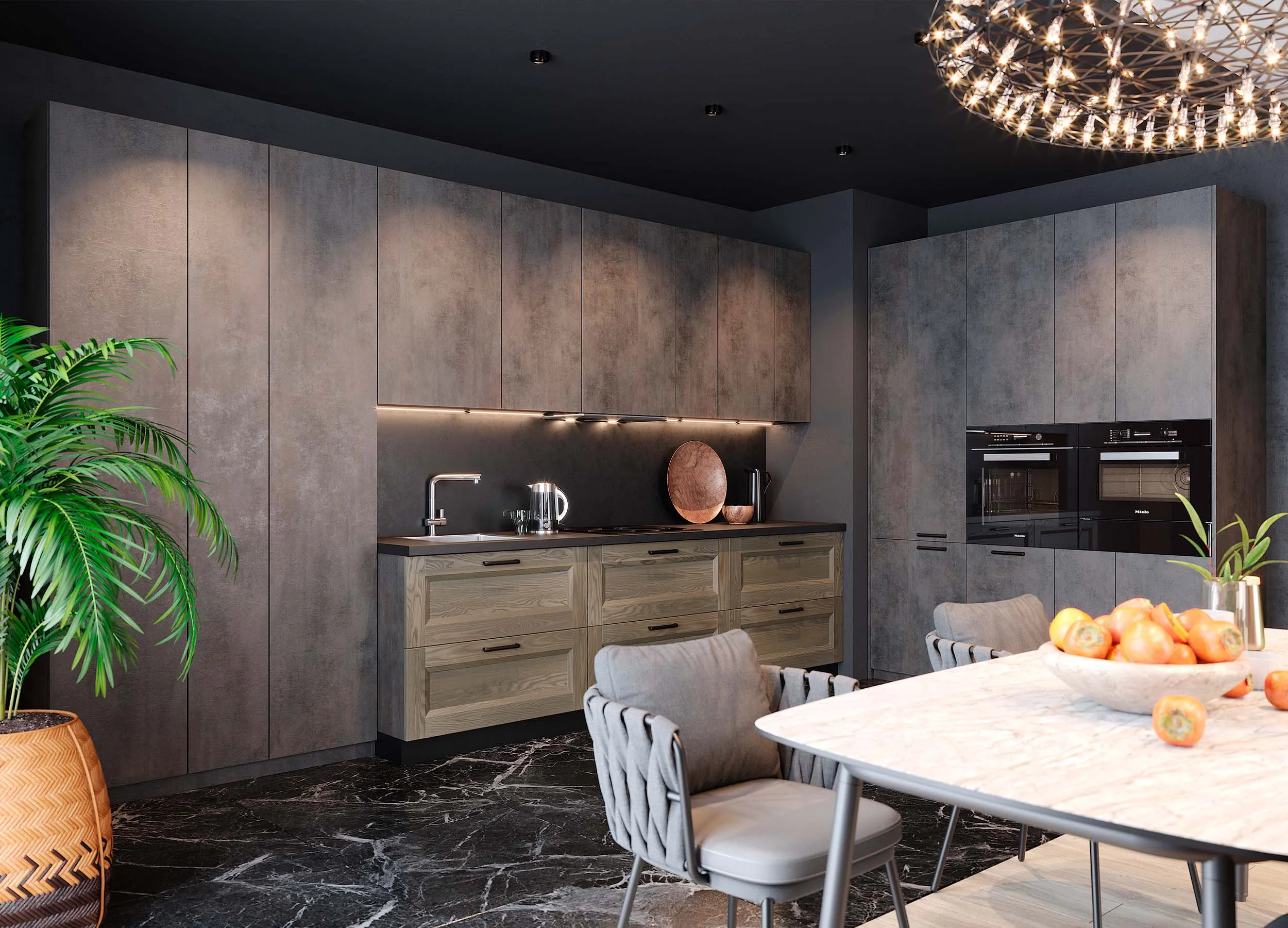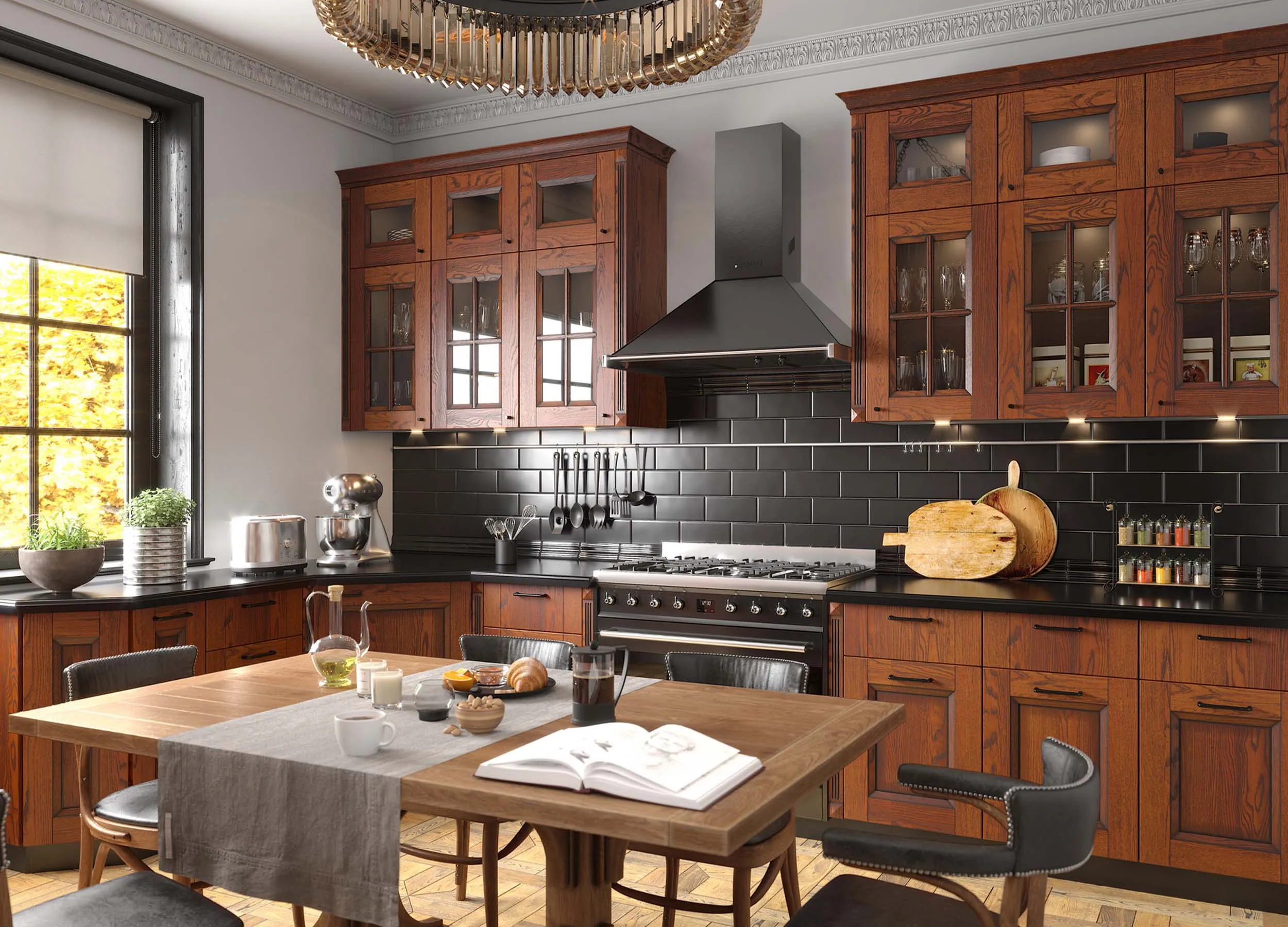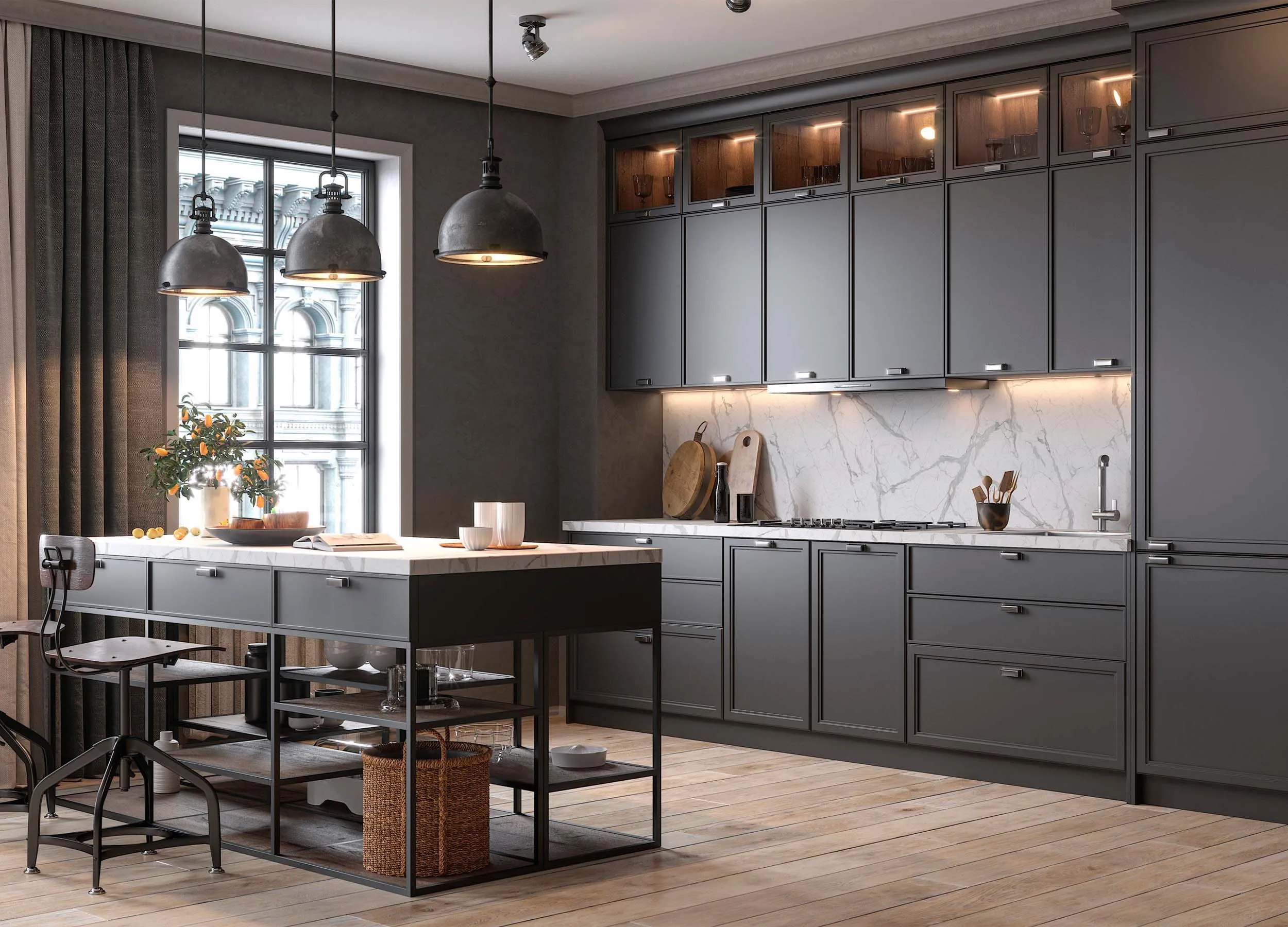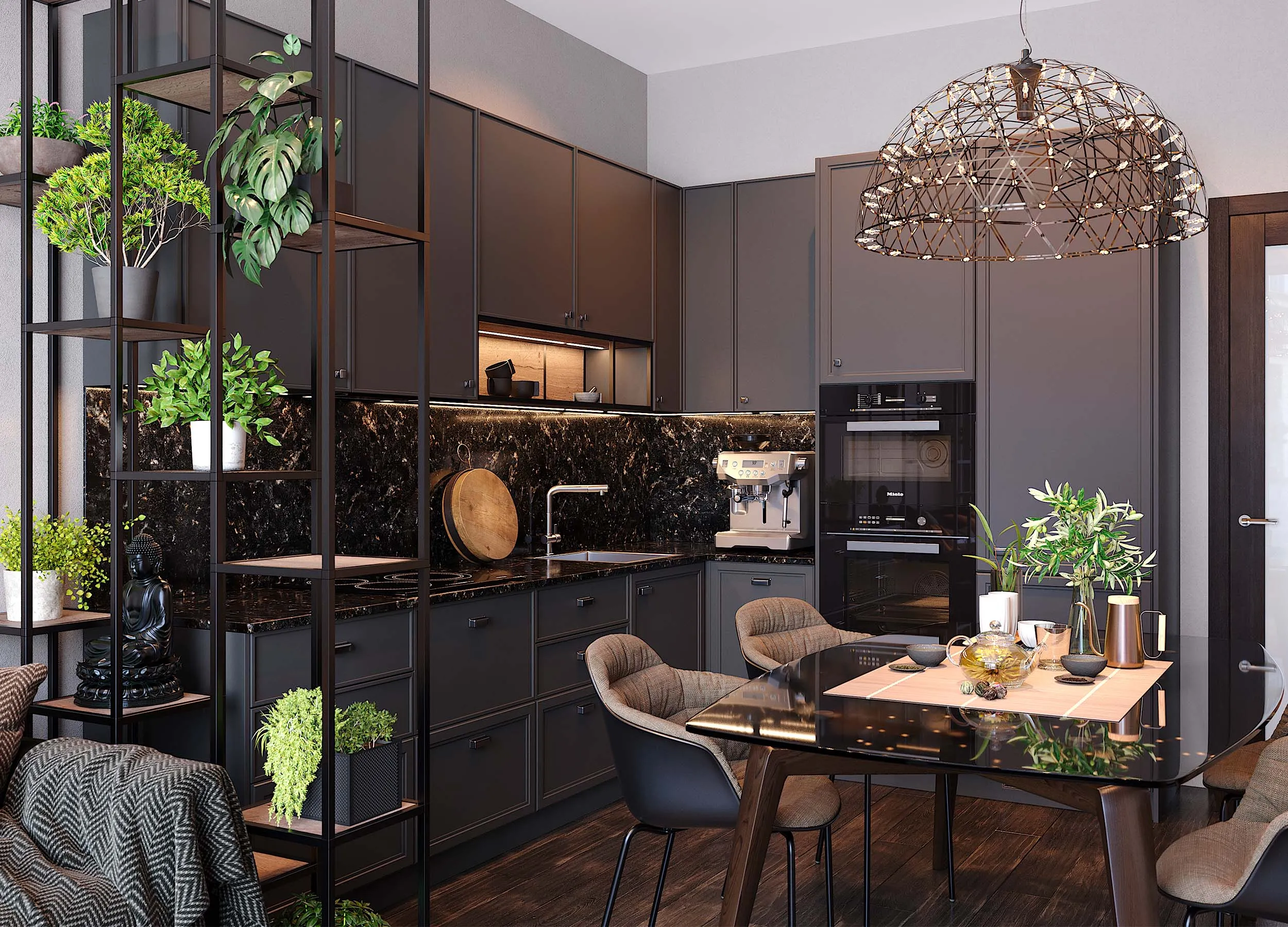 Темная матовая поверхность фасадов будет уместна в просторном помещении или на кухне, стилизованной таким образом: