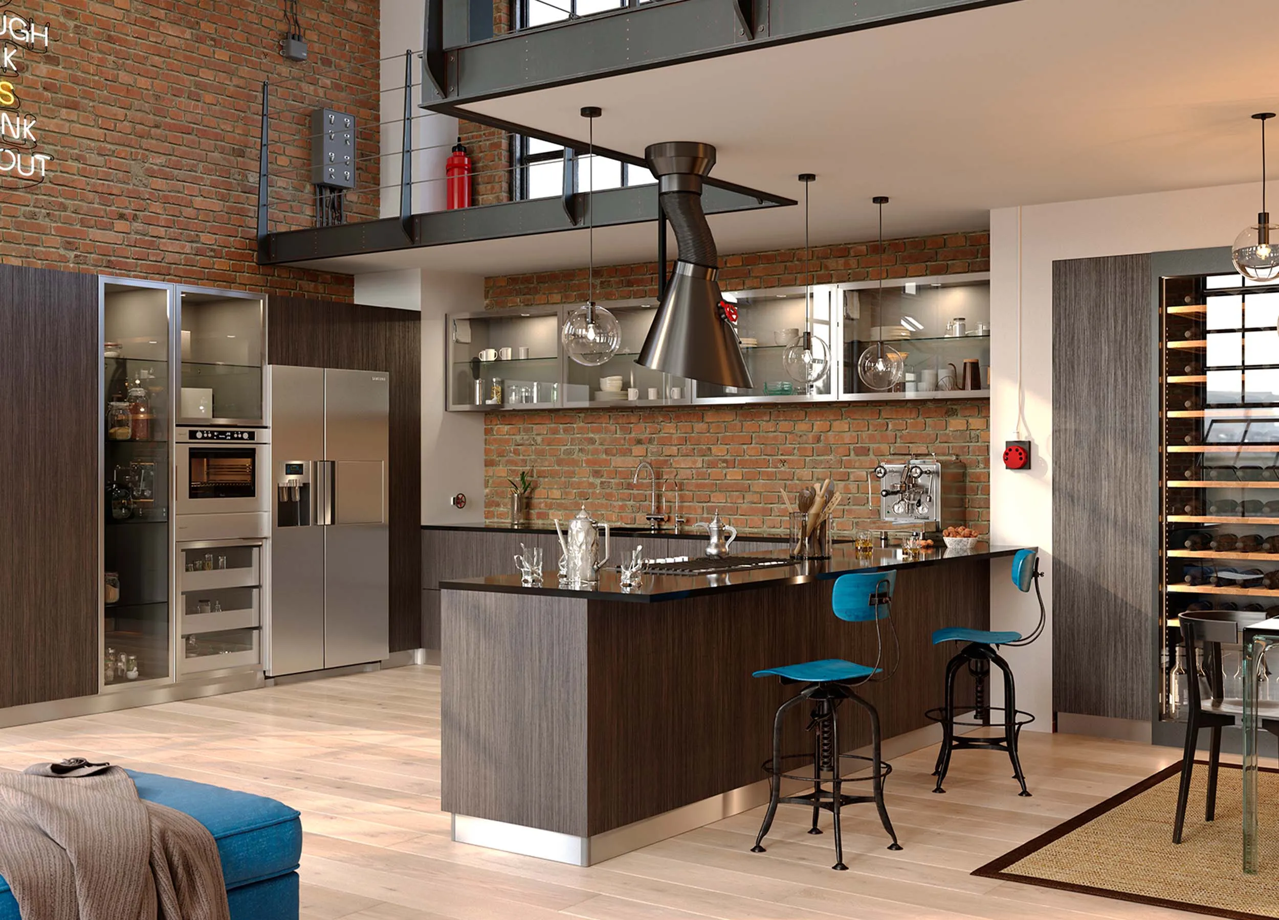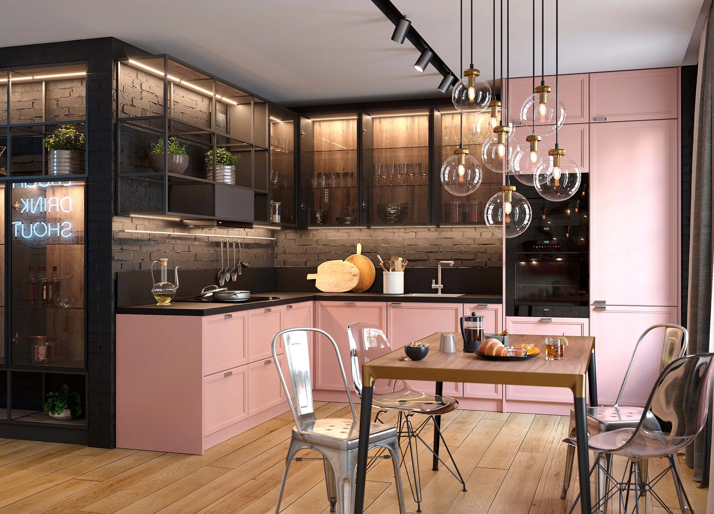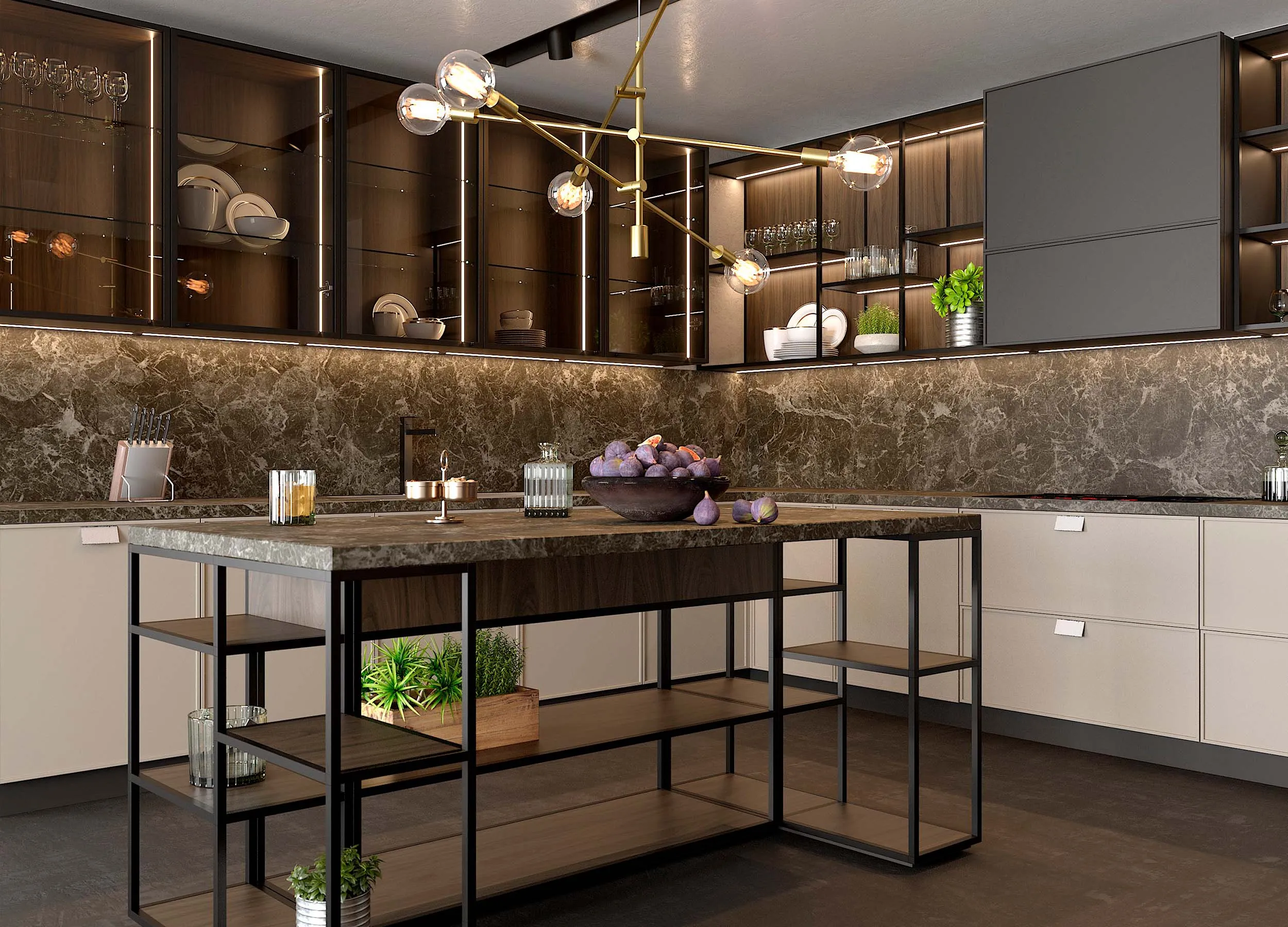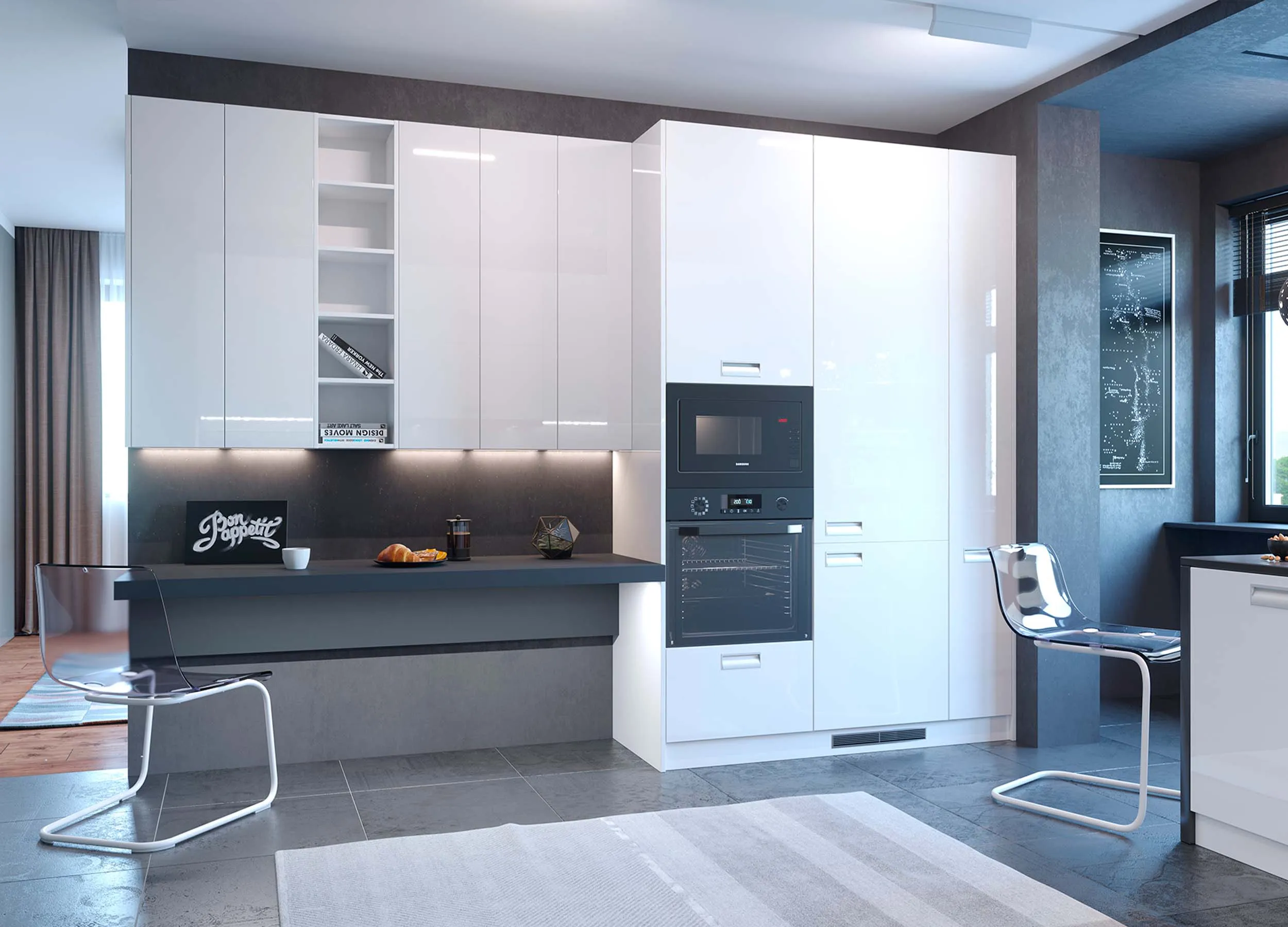 Особое внимание уделите освещению рабочей поверхности. Всегда есть возможность установки декоративной подсветки в нижних панелях подвесных модулей.