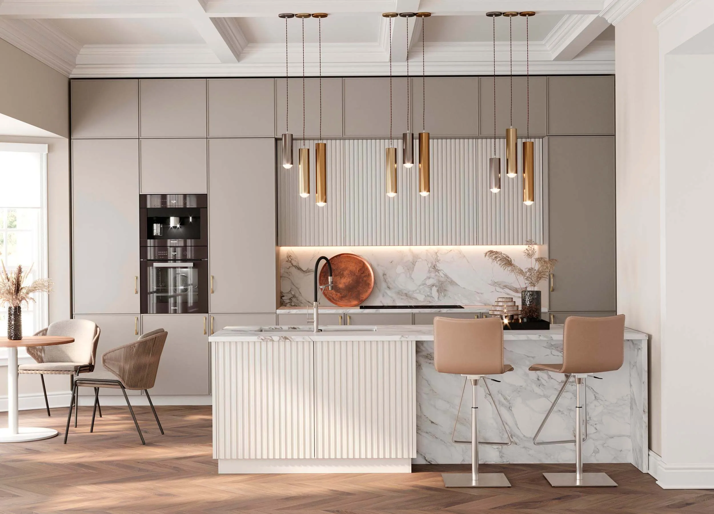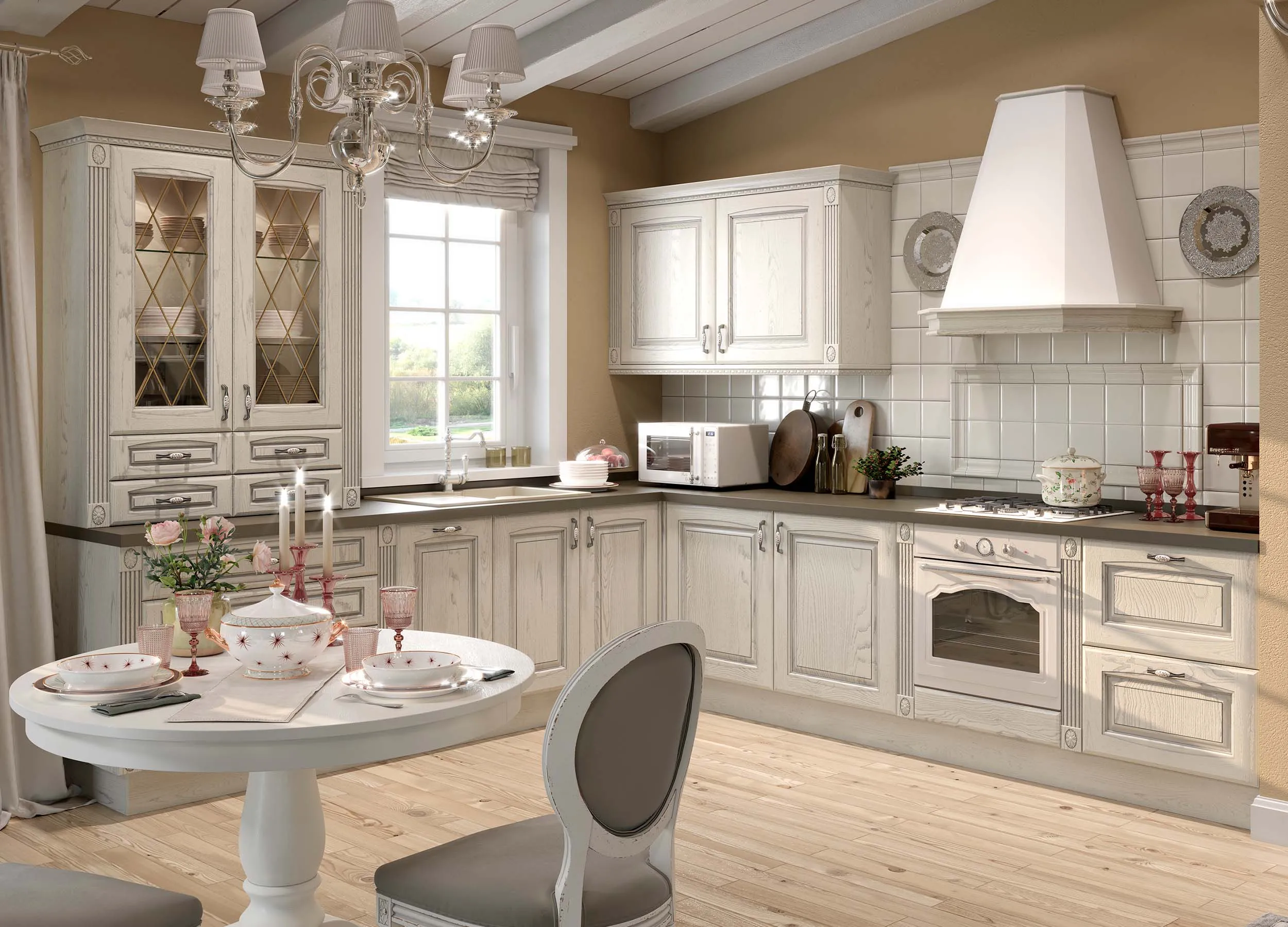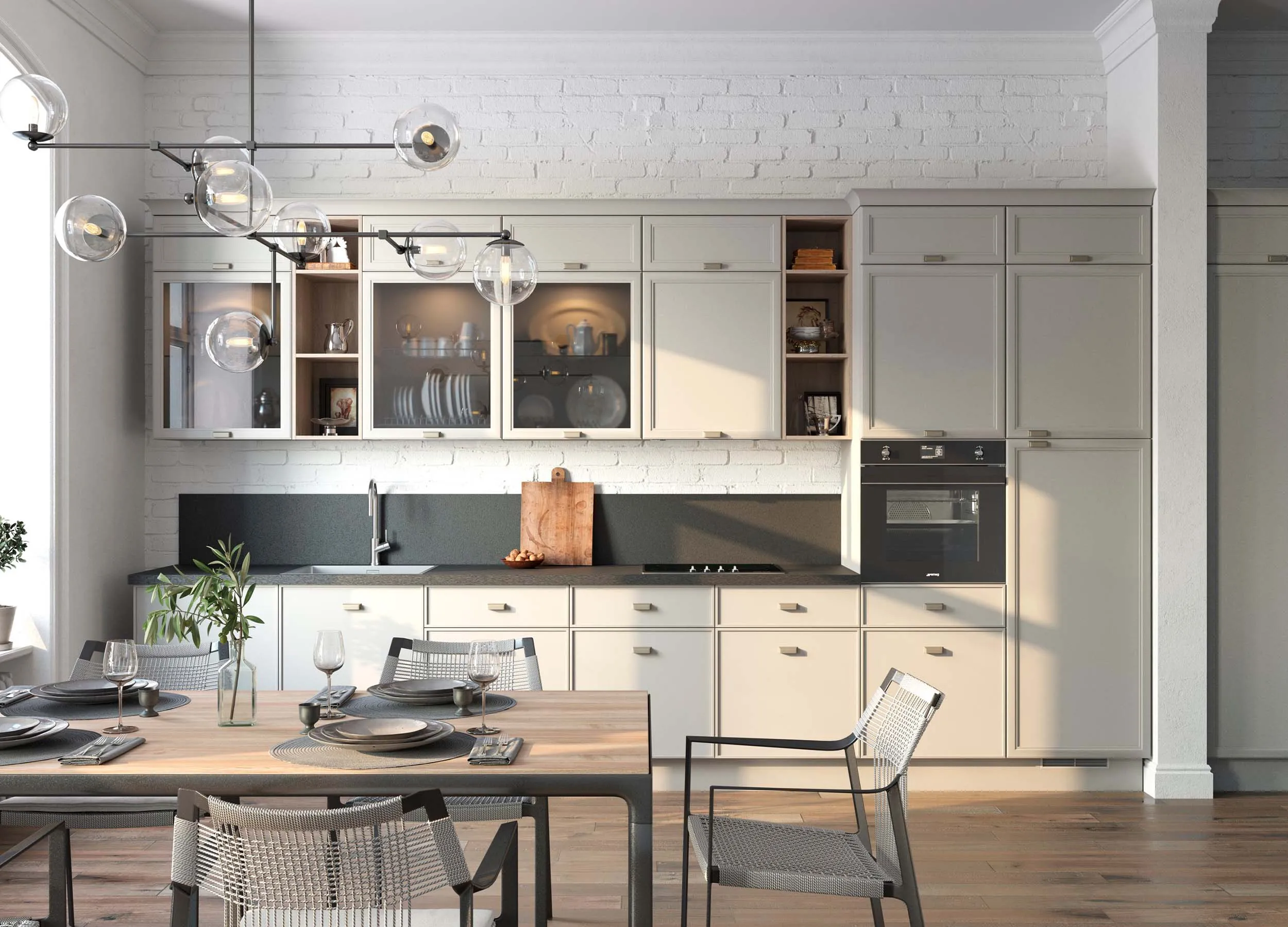 Бежевый ‒ это домашний уют и покой, строгая сдержанность или элегантная роскошь (на ваш выбор). Бежевый для фасадов хорош как в классических коллекциях, так и в аскетичном модерне; великолепно выглядит с позолоченными аксессуарами (классика) и прекрасен с матовым хромом (современный модерн). Все зависит от выбранного стилевого направления помещения и ваших пожеланий.