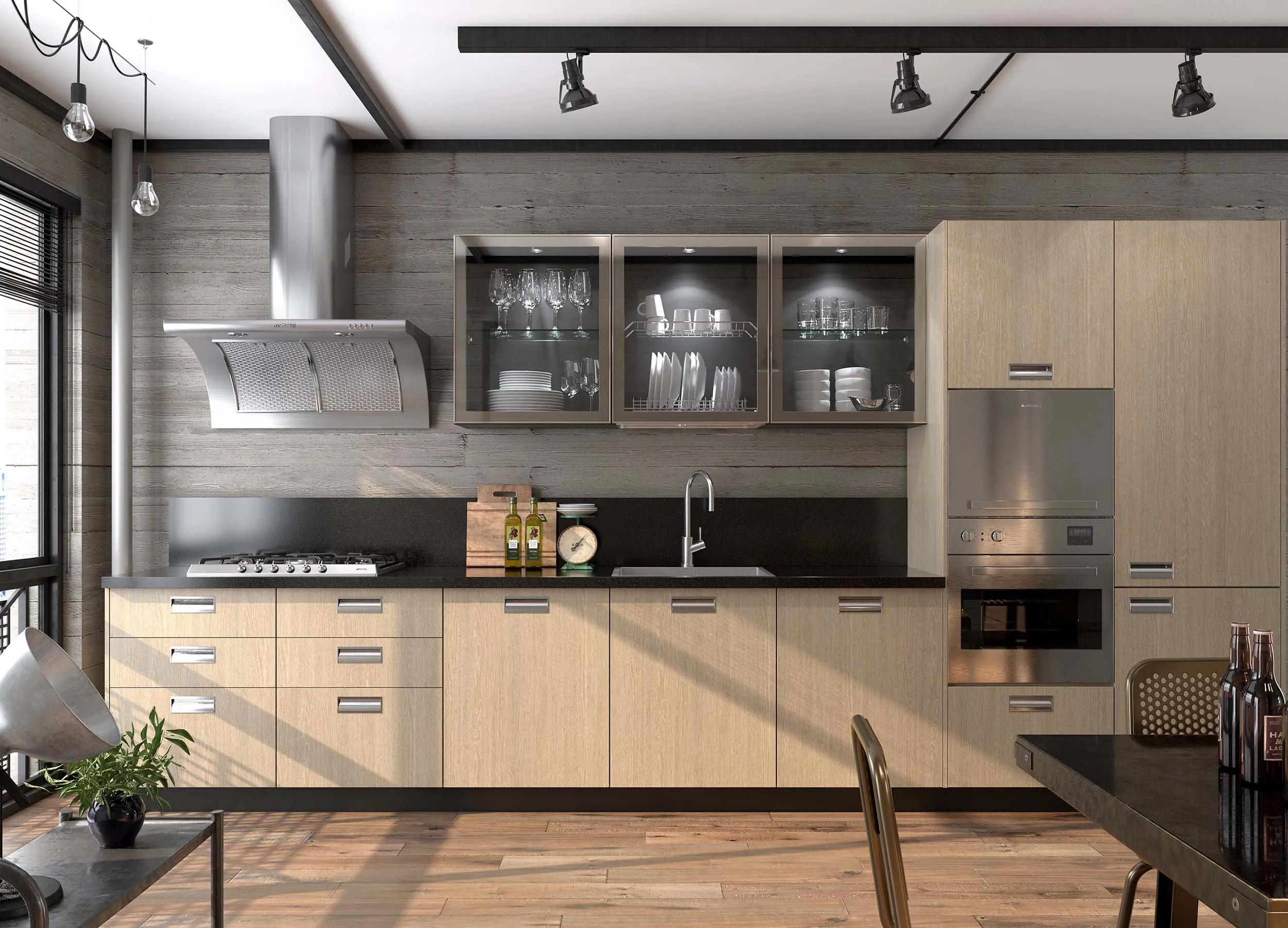Поскольку натуральный материал используется только для лицевой обработки фасадов (тонкие листы), он не снижает потрясающих характеристик МДФ, касающихся износостойкости. Внешний вид шпонированной кухонной мебели выигрывает благодаря имитации древесного рисунка, такие фасады смотрятся дорого и благородно. Естественно, ценовая категория кухни будет уже гораздо выше ‒ использование натуральных материалов при изготовлении фасадов неизбежно поднимает стоимость изделия.