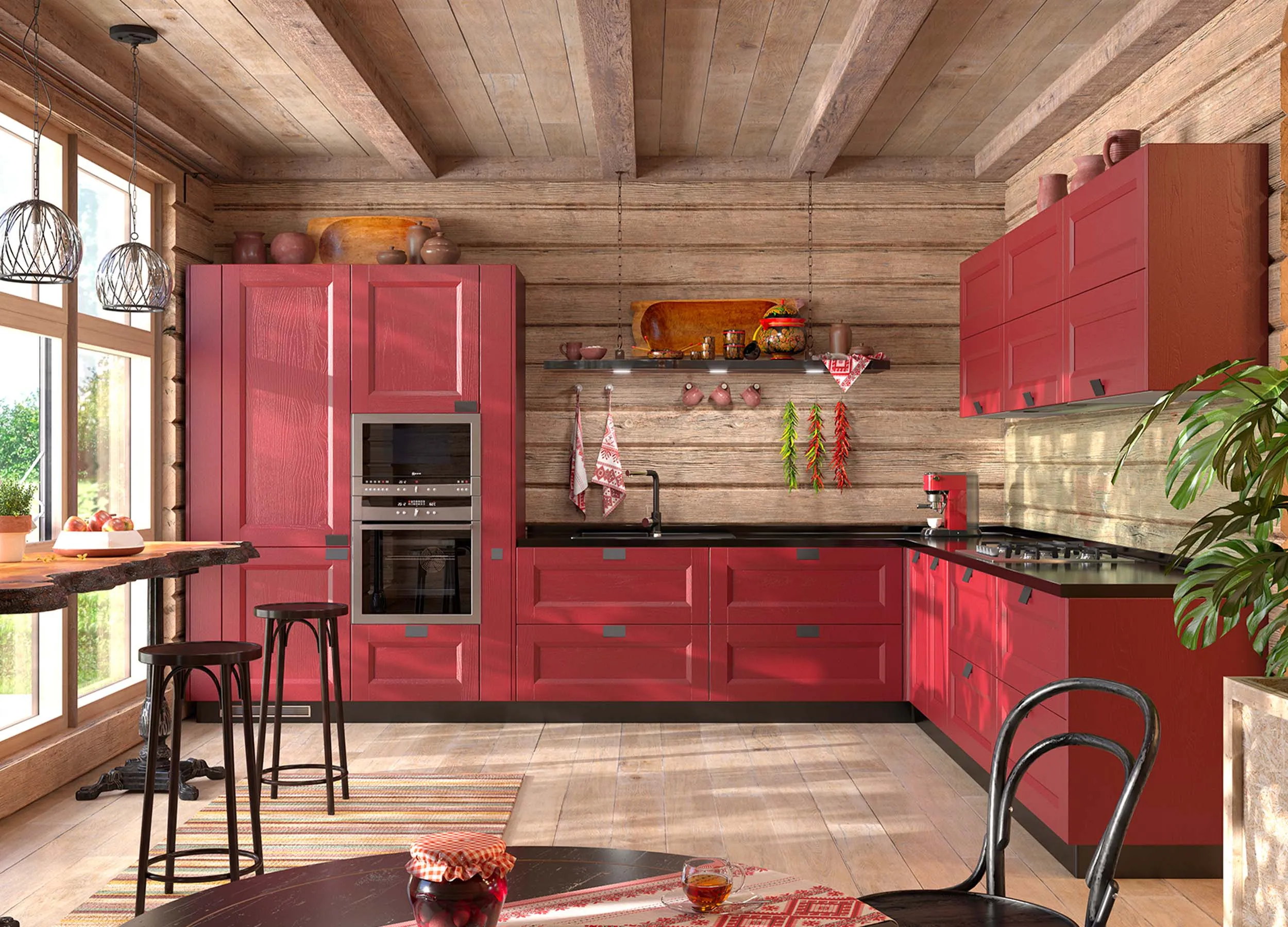 Фасады красного, оранжевого и желтого цветов делают мебель зрительно шире. Возбуждают аппетит, поднимают настроение и красивы в лучах солнечного цвета: