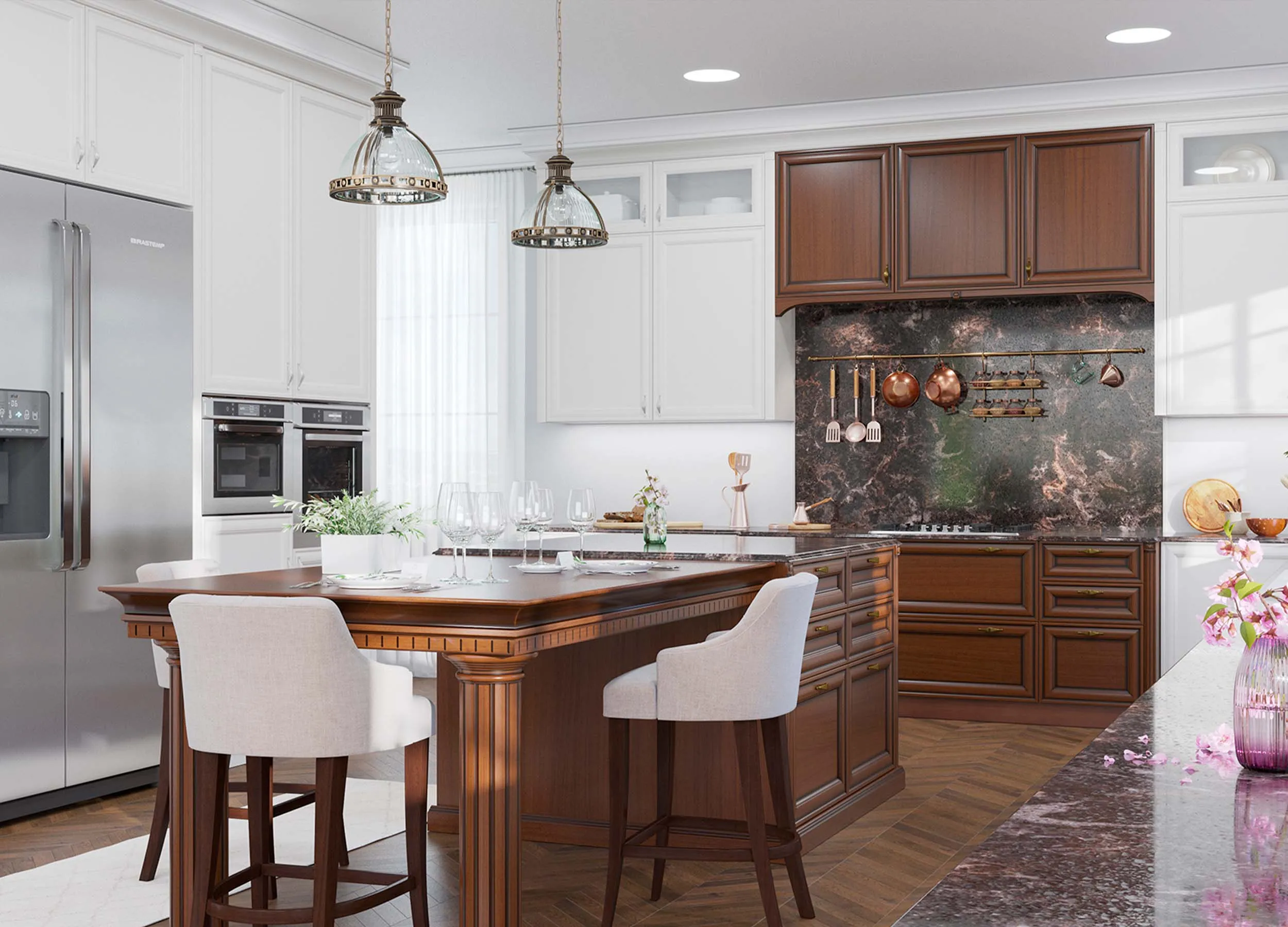 Коричневый ‒ природный и привычный человеческому глазу. Как никакой другой подходит для кухонных фасадов.