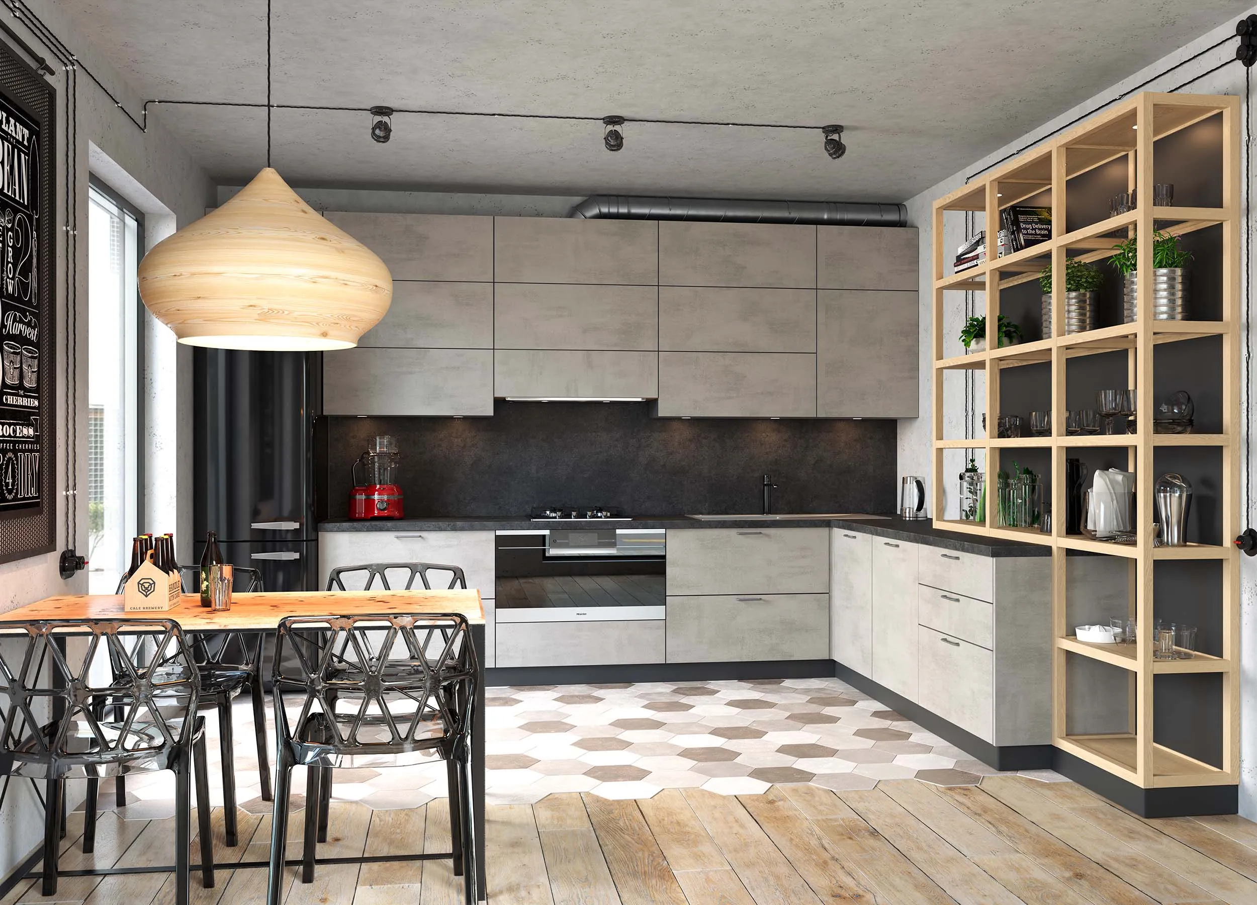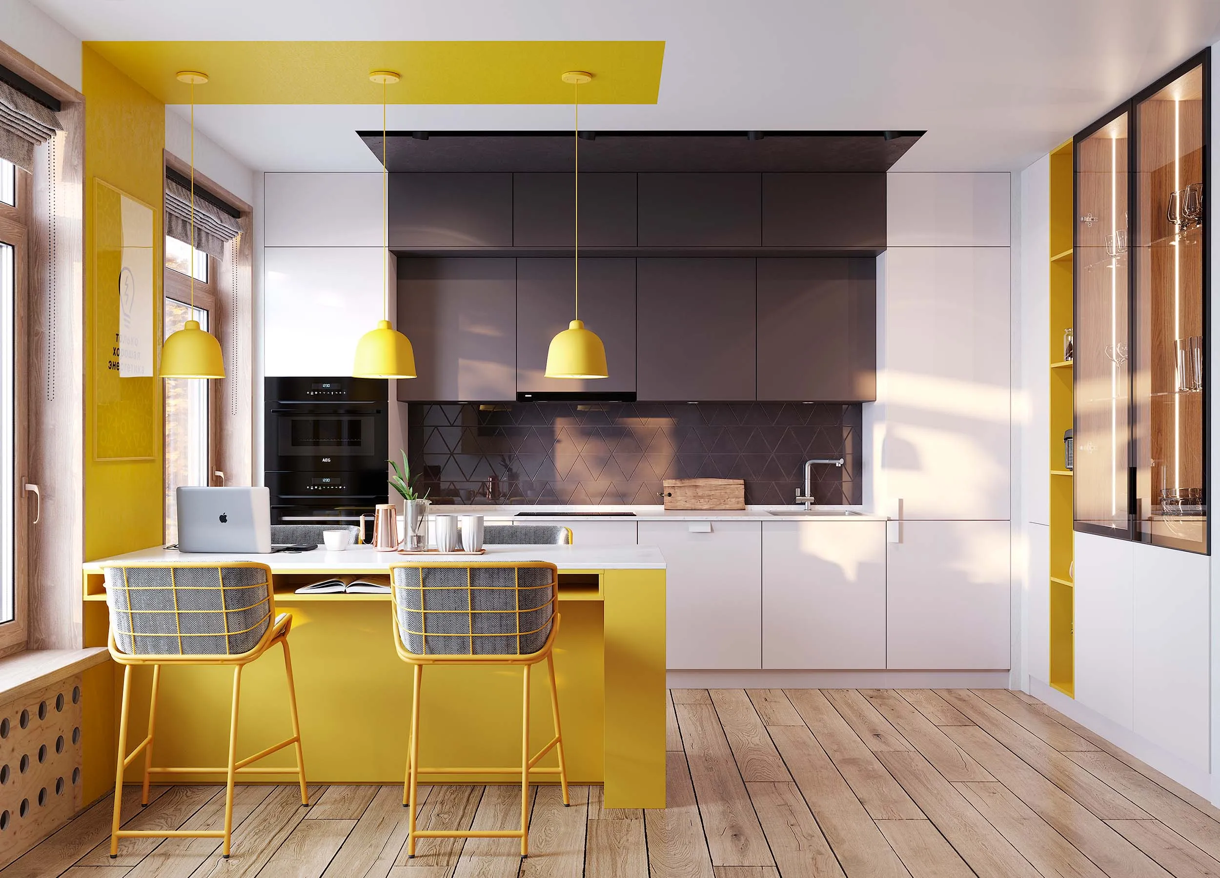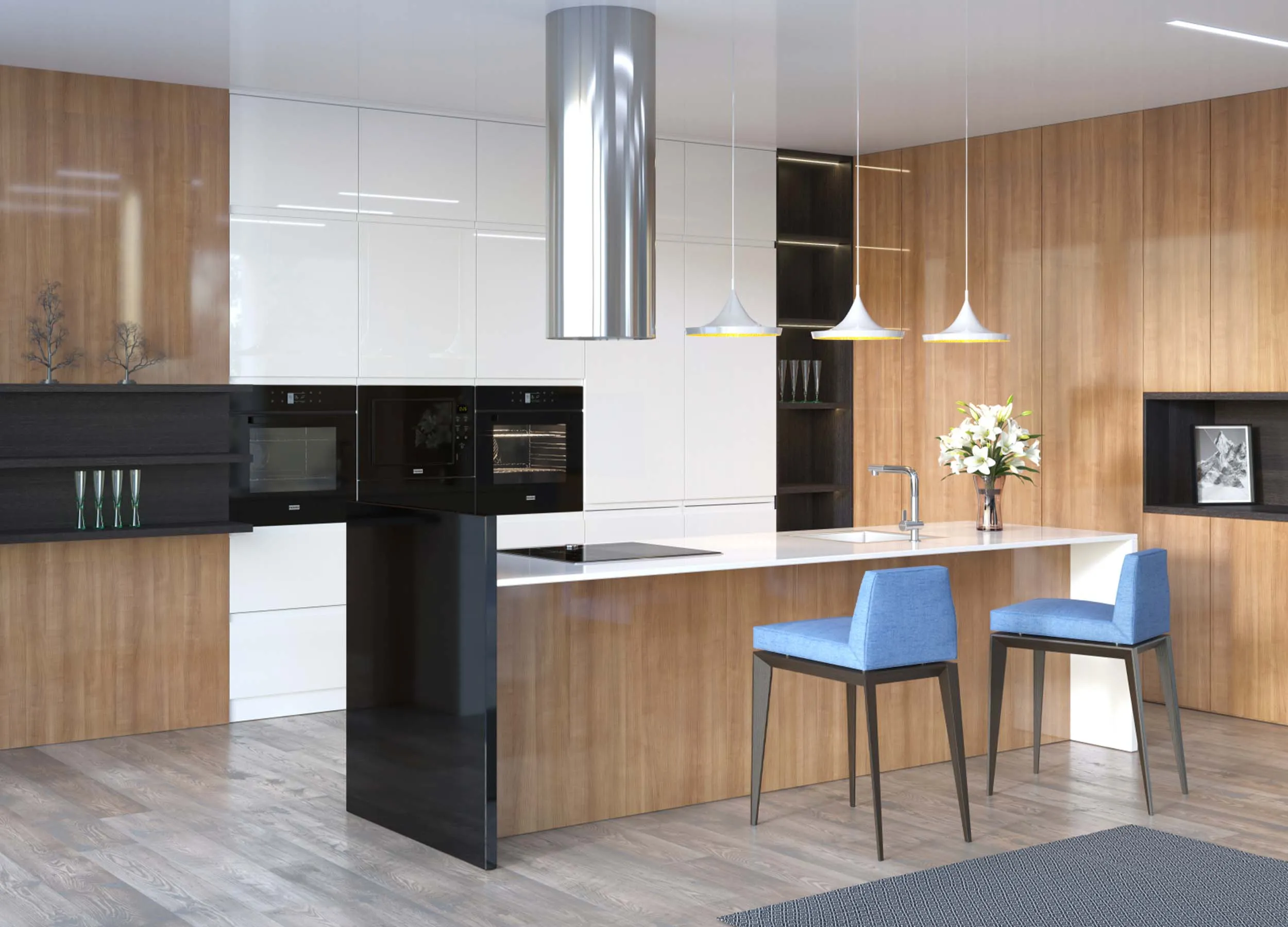 Черный, серый и белые цвета беспроигрышны. Великолепно сочетаются с любой отделкой помещения. Никогда не надоедят и будут актуальны долгие годы. Вы сможете легко и быстро сменить настроение кухни, обновив текстиль или разбавив монотонную палитру несколькими яркими акцентами. Отличный выбор для современной кухни.