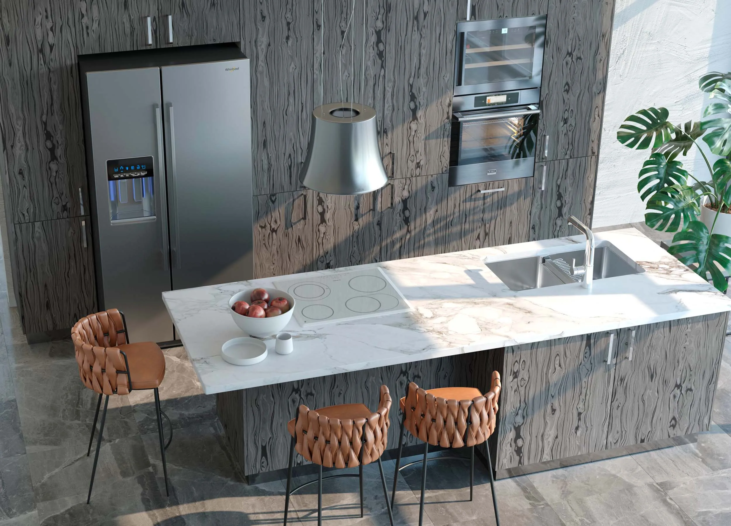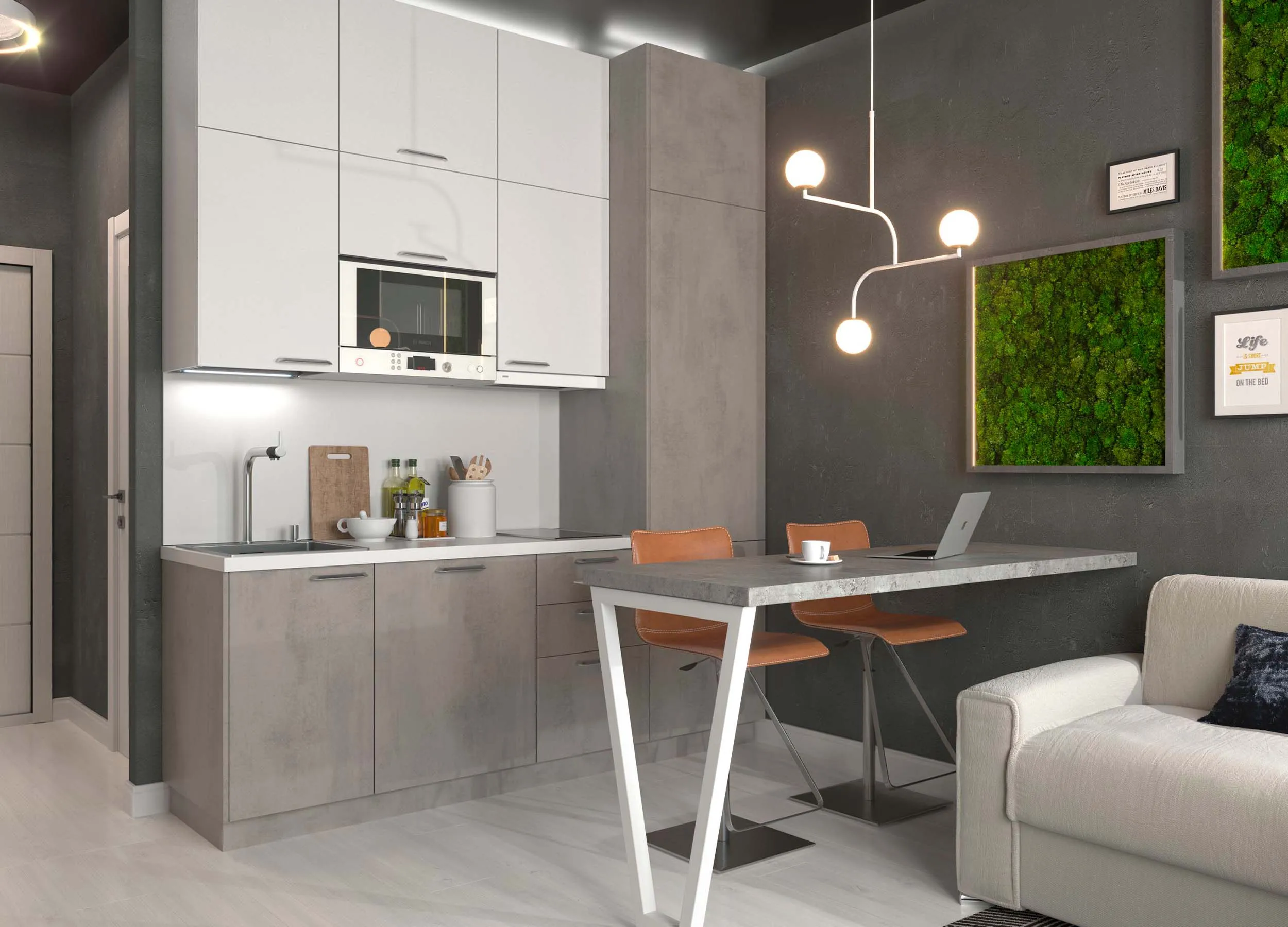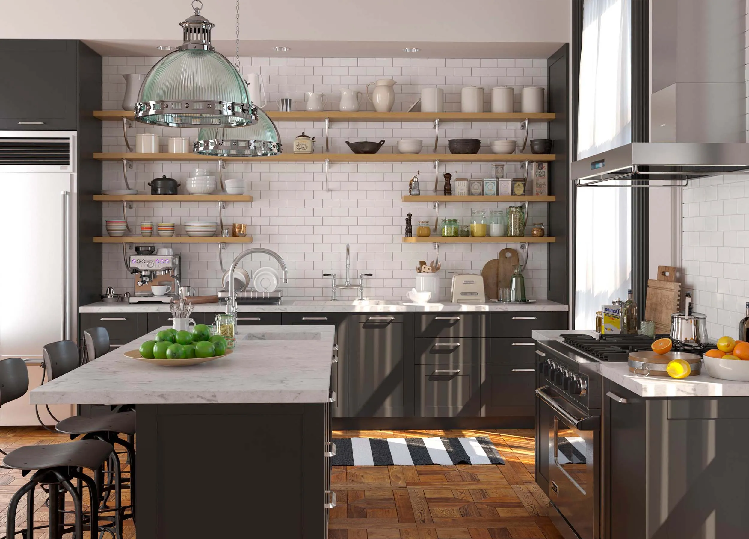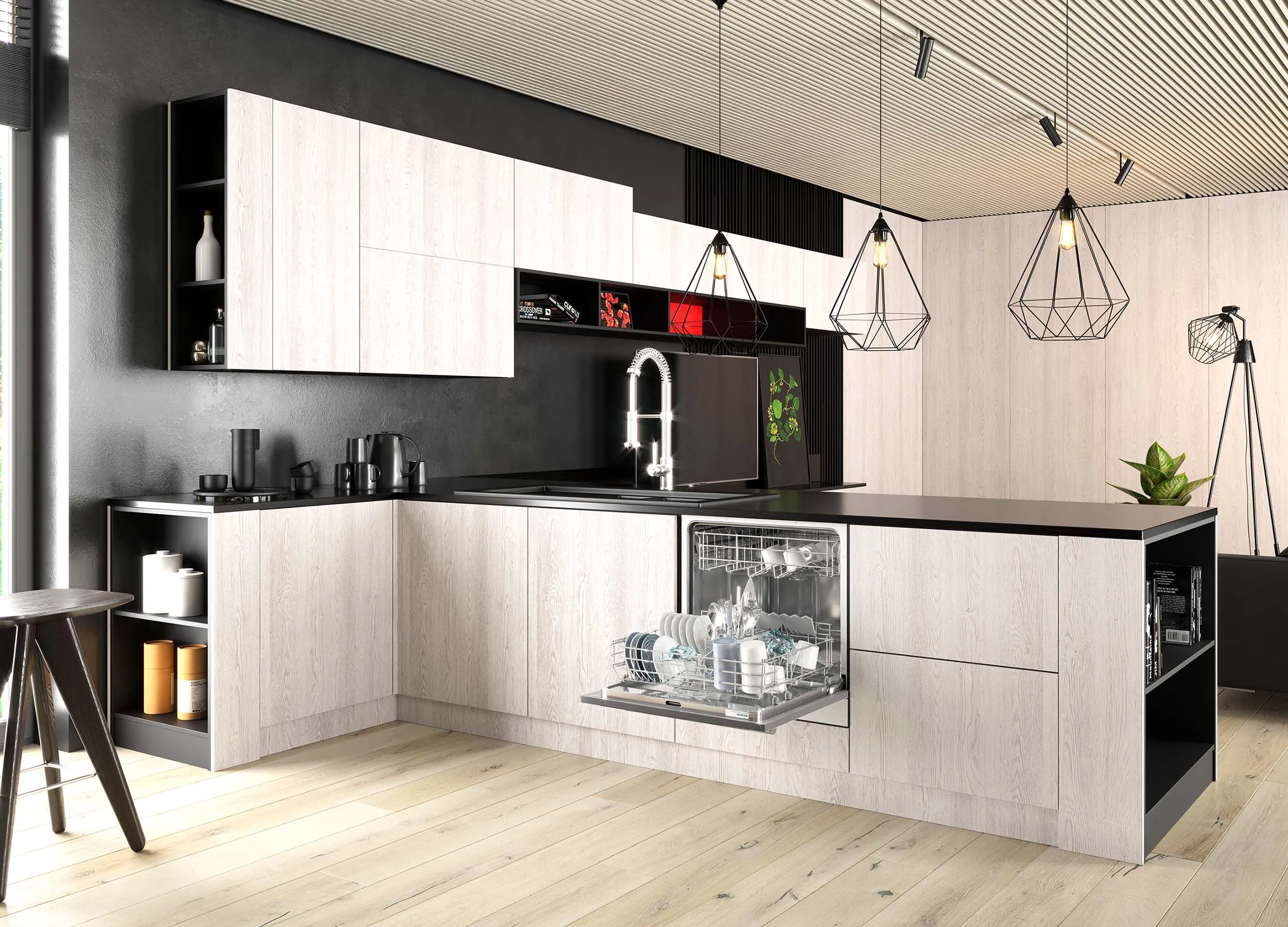 Черный, серый и белые цвета беспроигрышны. Великолепно сочетаются с любой отделкой помещения. Никогда не надоедят и будут актуальны долгие годы. Вы сможете легко и быстро сменить настроение кухни, обновив текстиль или разбавив монотонную палитру несколькими яркими акцентами. Отличный выбор для современной кухни.
