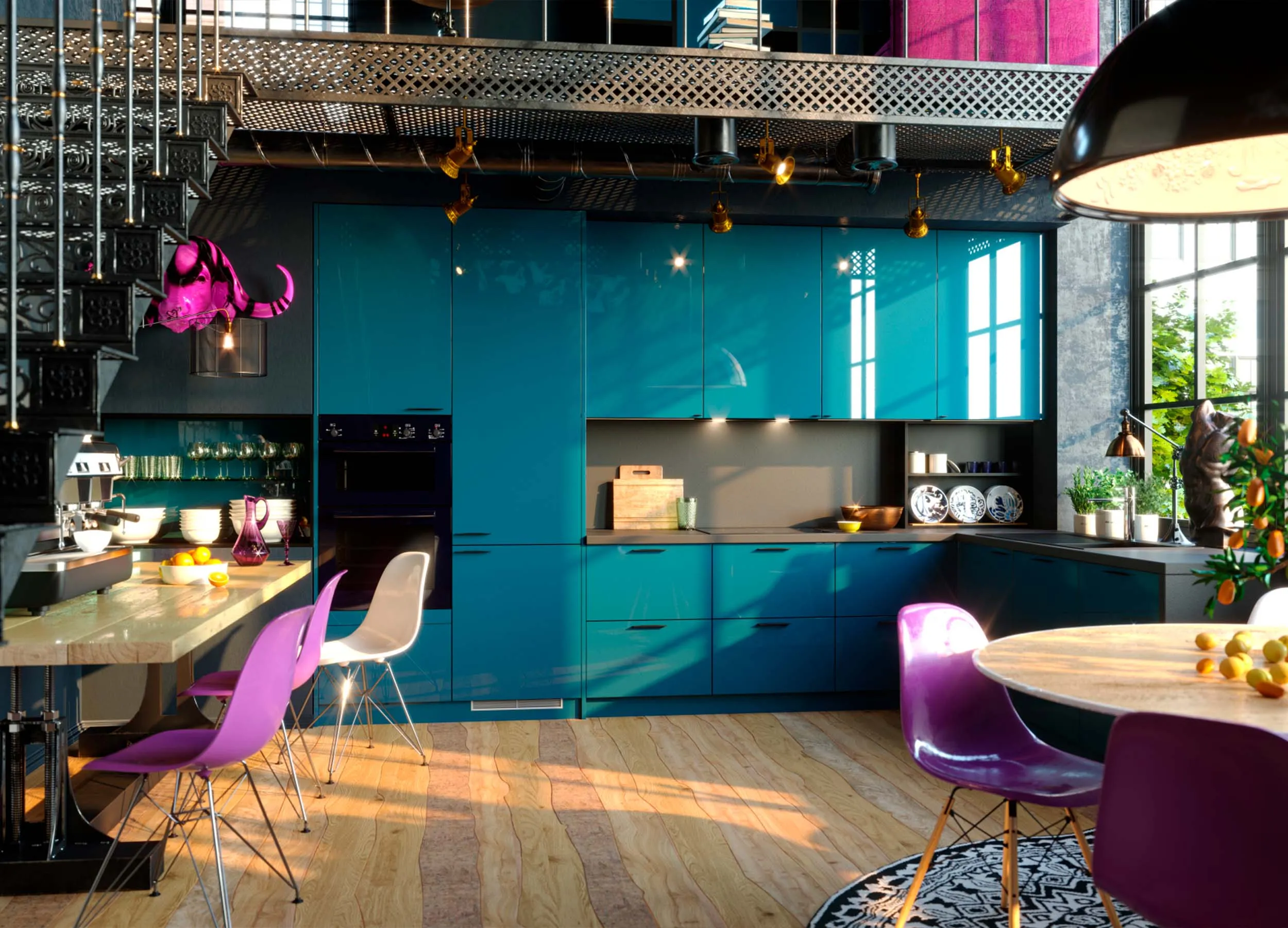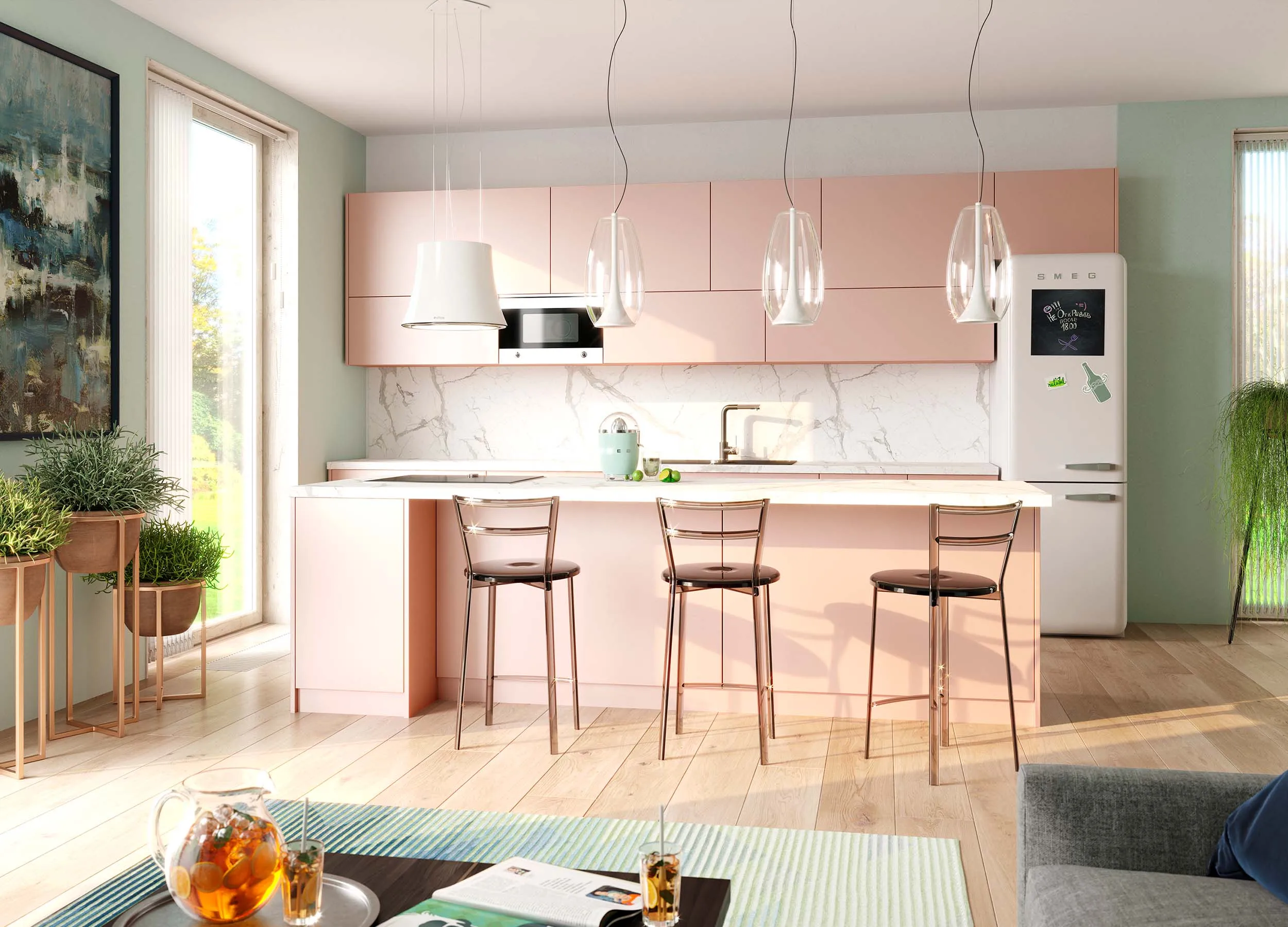 Фиолетовый и розовый, использованные на кухне для фасадов, привнесут в вашу жизнь немного таинственности. Старайтесь не переборщить с яркими оттенками, сделайте выбор в пользу светлой палитры.
