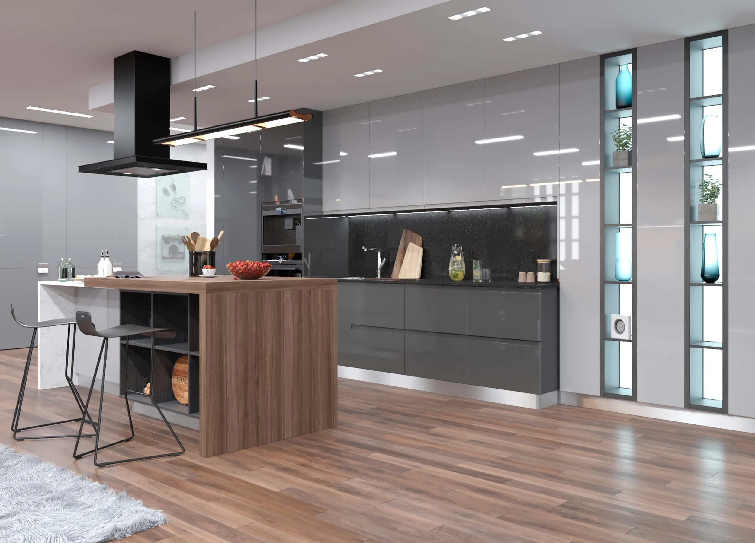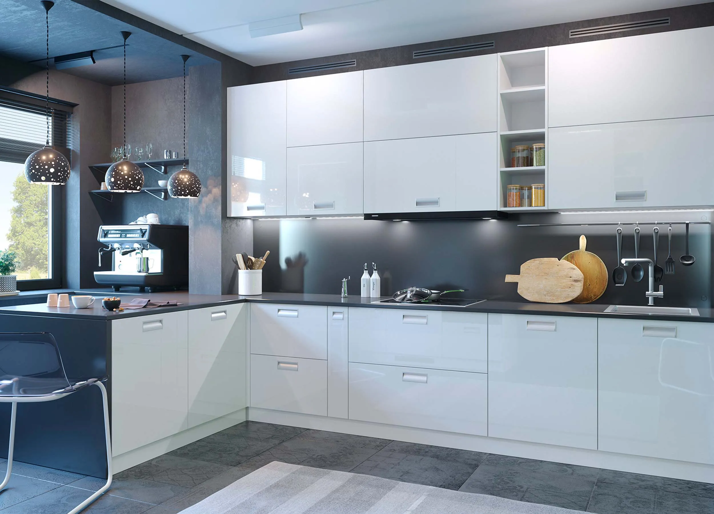 Глянцевая поверхность фасадов (даже темная) отражает источники света, визуально добавляя пространства. Светлый глянец однозначно подходит для небольших и темных кухонь.