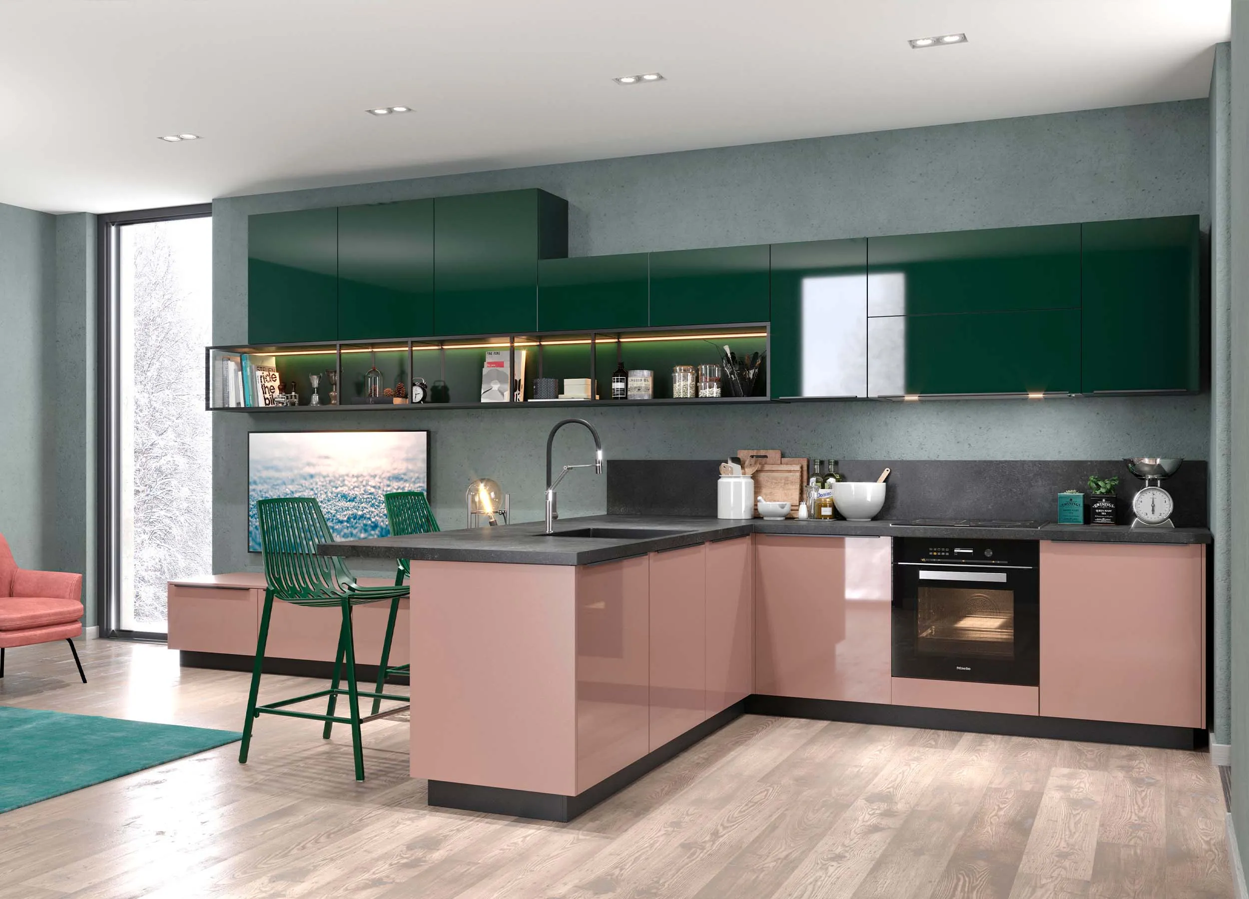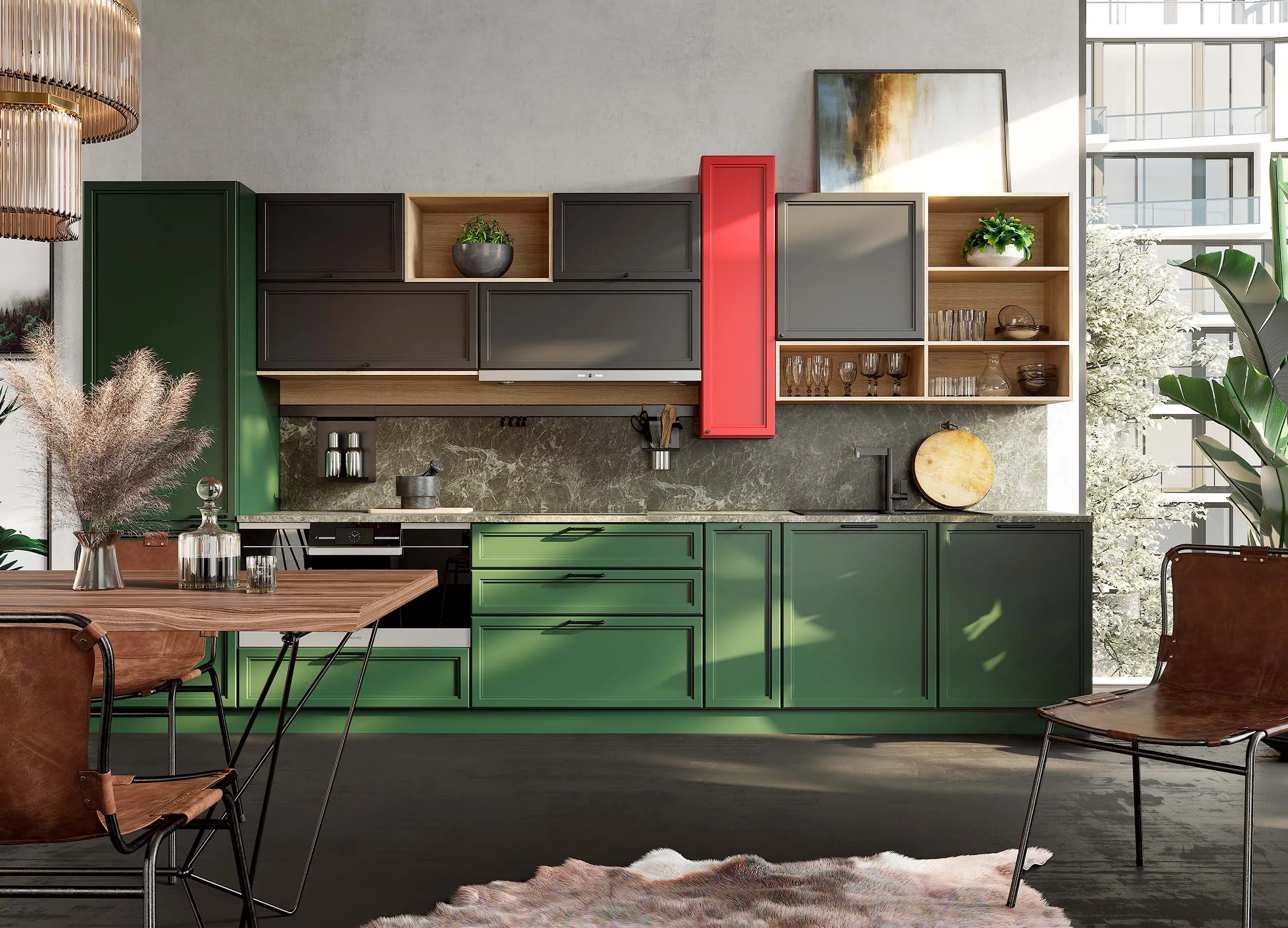 Зеленая кухня сделает помещение легче и воздушнее. Цвет благоприятно влияет на нервную систему, способствует снятию напряжения и не надоест даже по прошествии большого количества времени.