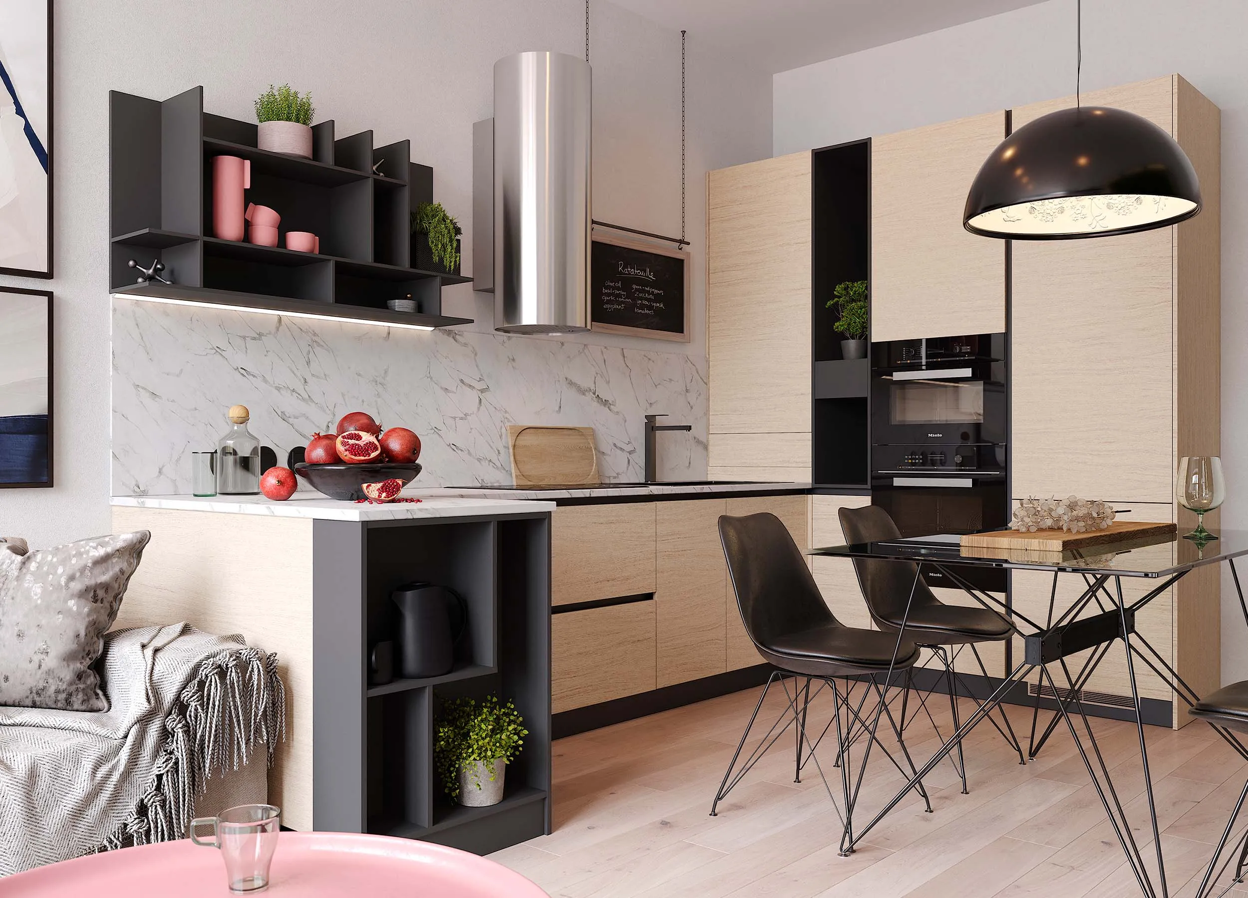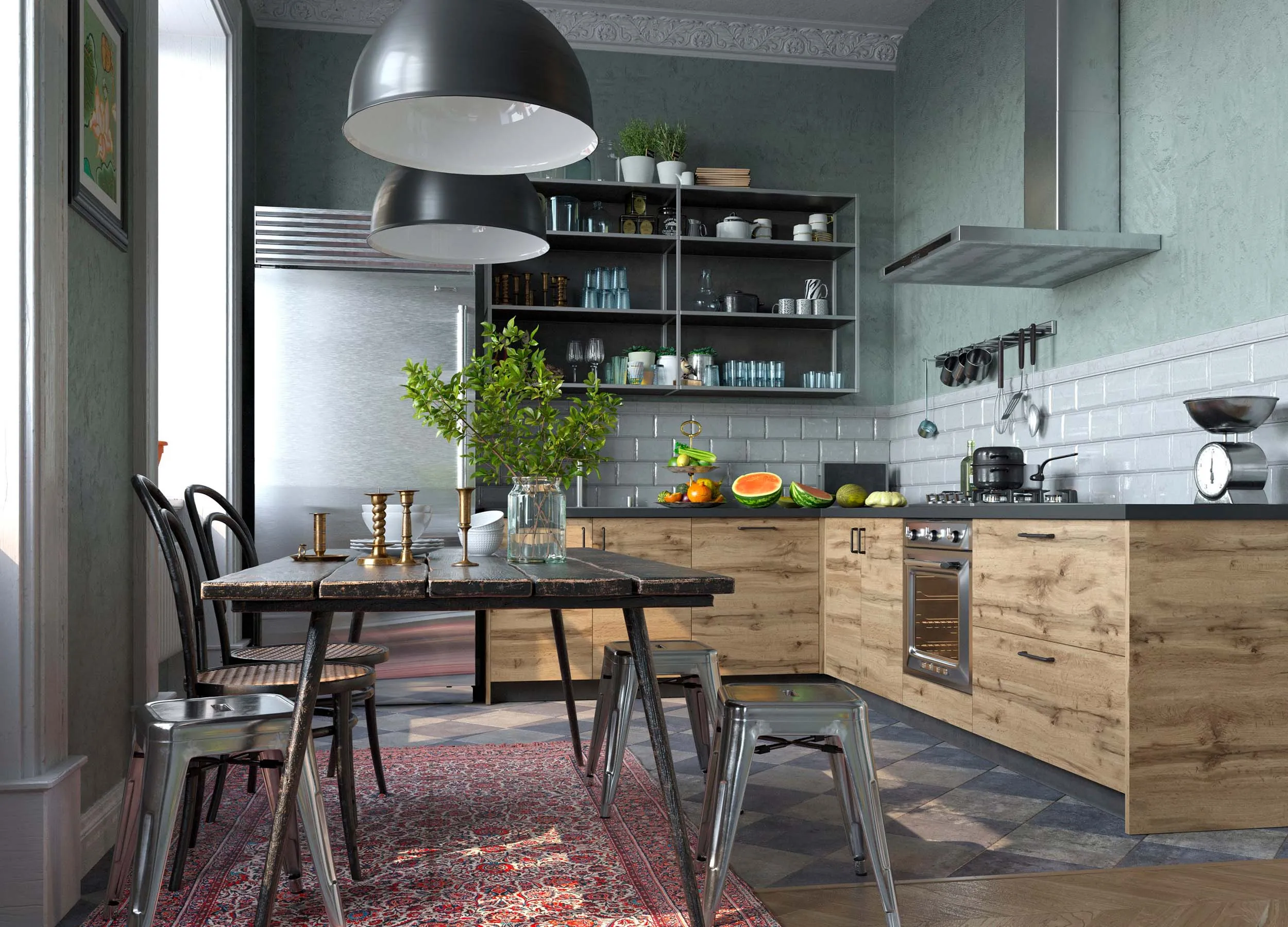 Помимо мебели, бытовой техники и кухонной утвари, нужно будет подобрать текстиль и обеденную группу.
