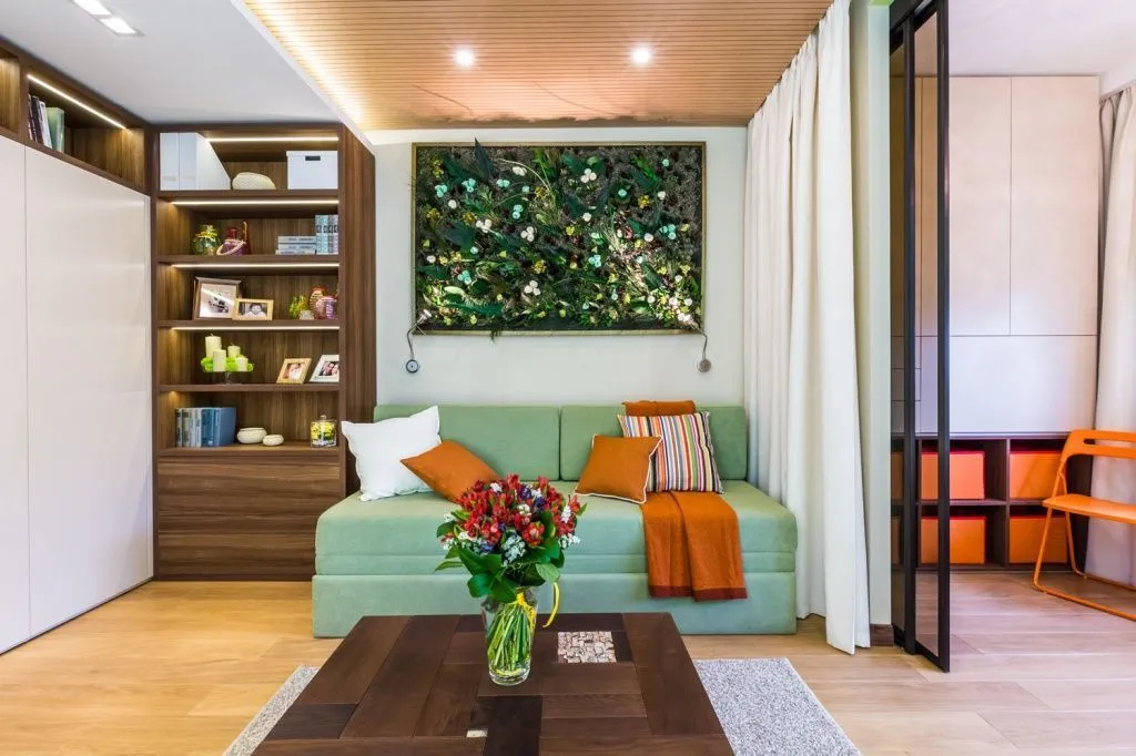 Серый цвет является отличным дополнением для сочных оттенков оранжевого. Хорошо подходит для гостиных, совмещенных со спальнями. |
