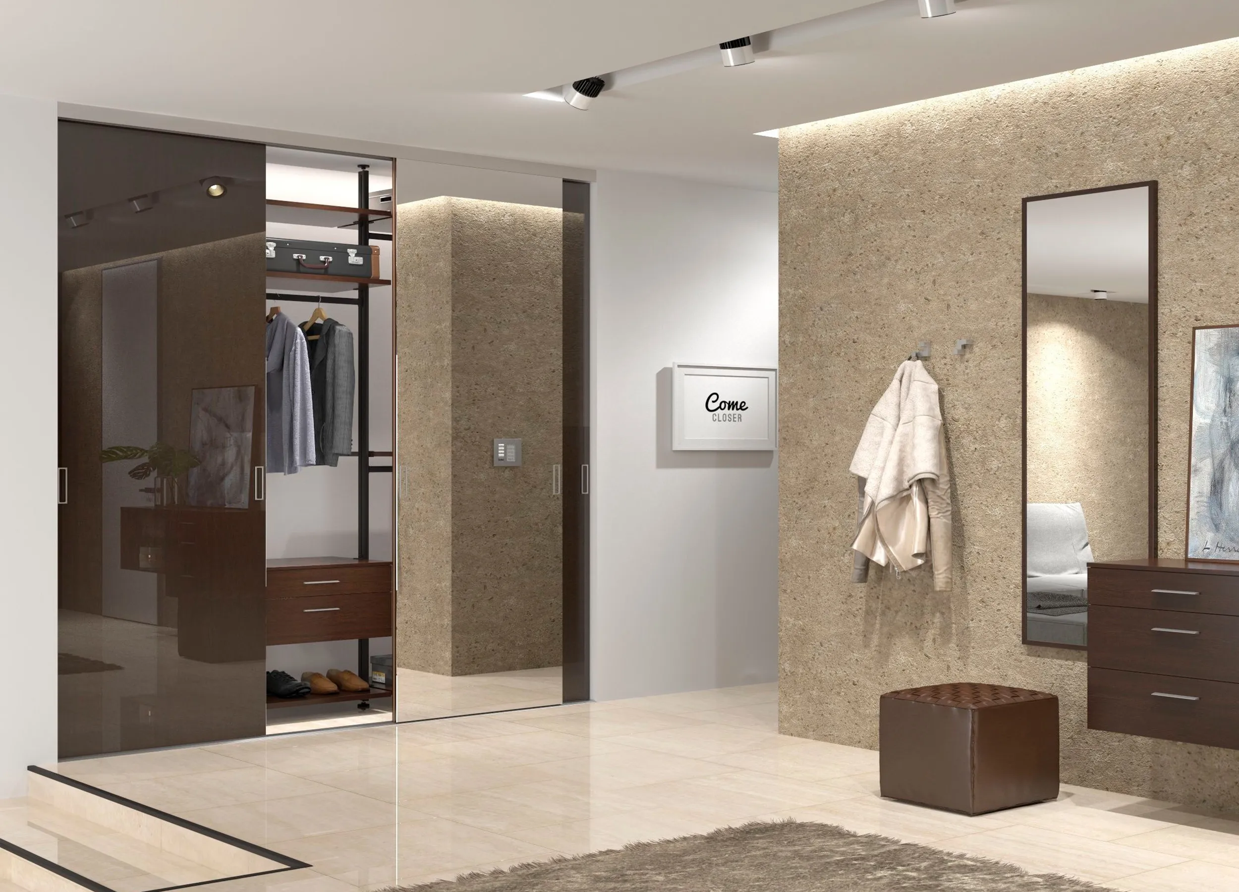 Ваш коридор имеет небольшую ширину? Тогда рассматривайте шкафы-купе. Для их открывания не нужно много место. Останавливаясь на идее шкафа в узкую прихожую с раздвижными дверями, вы экономите пространство и можете организовать комфортную систему хранения. Выбирайте высокие модели шкафов, желательно под потолок. Благодаря большому количеству отсеков и полок, вы сможете на небольшой площади разместить максимальное количество вещей.