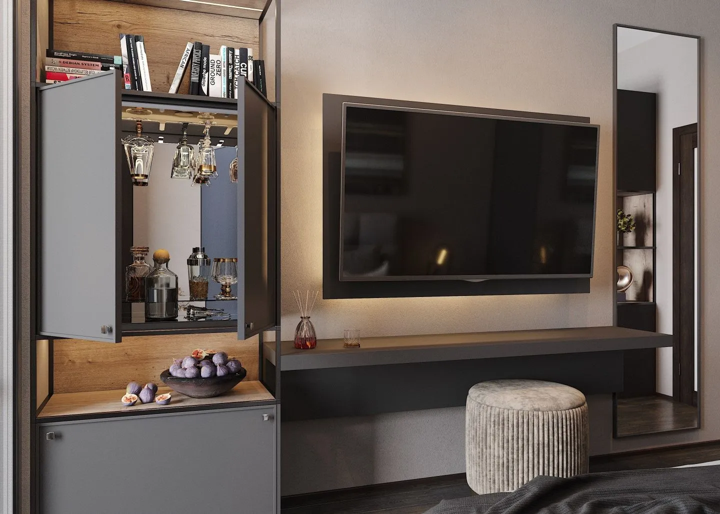 Освободите секцию от лишних предметов, а на заднюю стенку повесьте постер, акварельный рисунок или монохромную фотографию. И посмотрите, как изменится атмосфера в комнате. Отличная идея, если нужно решить, как креативно и со вкусом украсить стеллаж в гостиной, предназначенной для частого приема гостей. Рядом с картиной можно поставить изысканный тематический декор, но проследите, чтобы он не был слишком громоздким или красочным, и не перехватывал на себя взгляд зрителя – центром внимания должна оставаться стена.