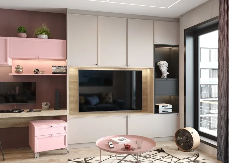 Дизайнеры не рекомендуют заставлять пространство гостиной громоздкой мебелью. Как правило, для нее больше подходят модульные стенки, которые всегда можно дополнить стеллажами или шкафом для одежды.