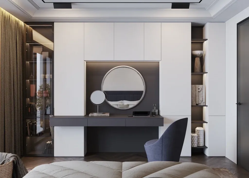 Спальня является также местом, где вечером приходится работать? Совместите угловой шкаф с небольшим письменным столом. Обычно женщины, собираясь выйти из дома, проводят много времени перед зеркалом. Установите в спальне туалетной столик с соответствующим освещением. Это позволить с комфортом совершать макияж и различные косметические процедуры.