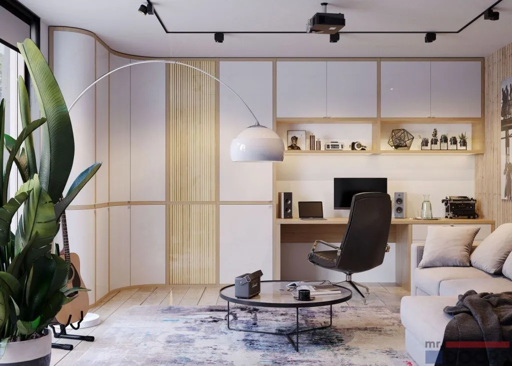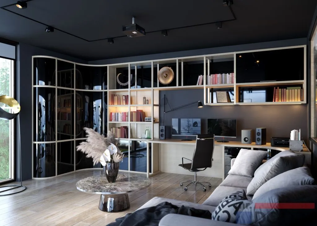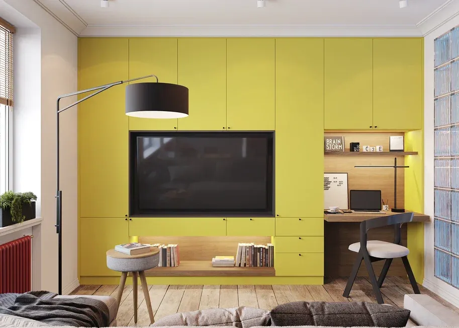При недостатке места в квартире, актуально использовать идею углового шкафа в гостиную, совмещенного с письменным столом.