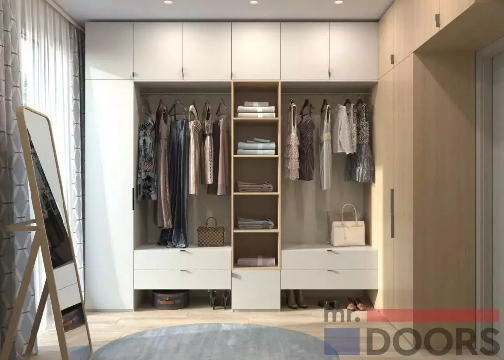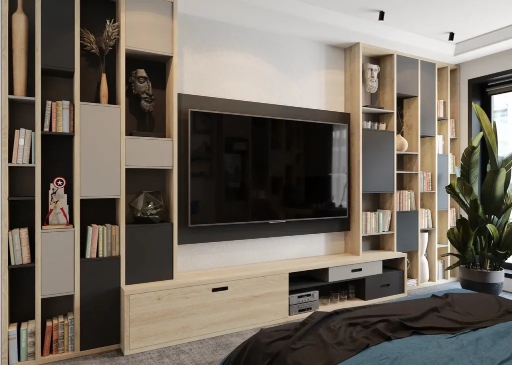 При их планировании также стоит уделить большое внимание внутреннему наполнению. Если вы располагаете шкаф напротив кровати, то продумайте место для установки телевизора.