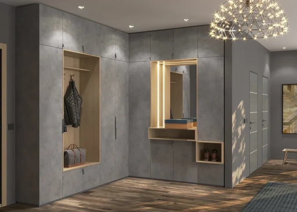 Идея использовать в прихожей угловой шкаф сразу решает множество вопросов с хранением. В зависимости от планировки помещения в коридор устанавливают корпусную, встроенную или полувстроенную мебель. Если площадь позволяет, то двери выбирают распашные или раздвижные. В небольшое помещение целесообразно установить шкафы-купе.
