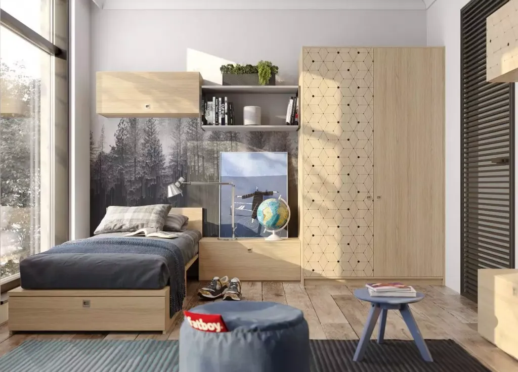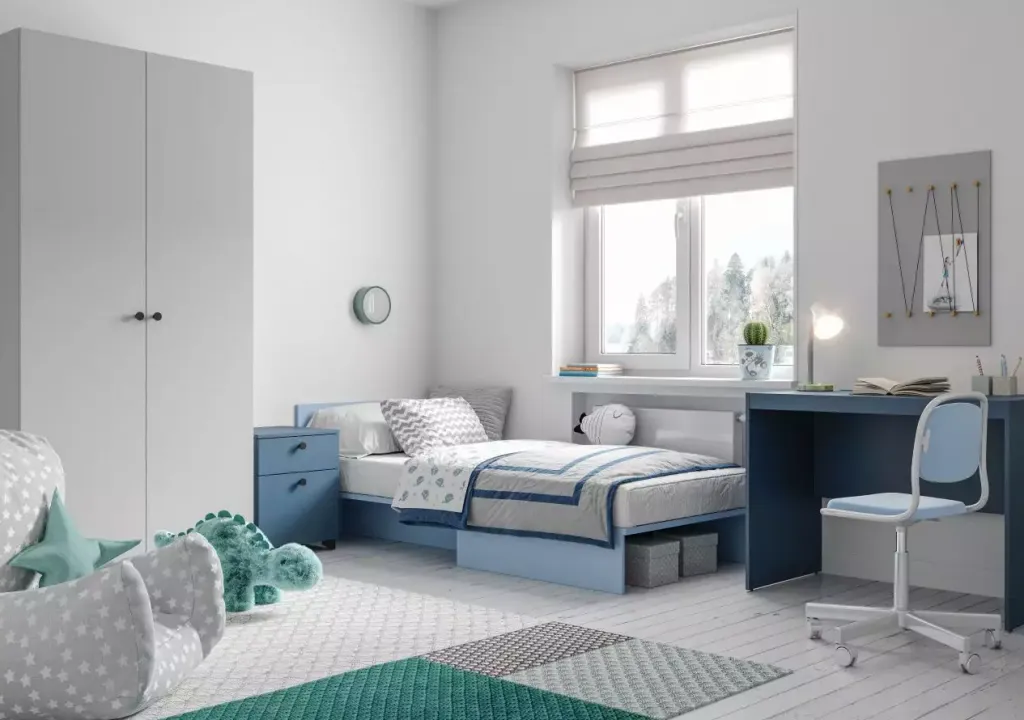 В первую очередь — это, конечно, кровать. Она может быть односпальной или полутораспальной, трансформером, который на день превращается в диван или убирается в шкаф. Да и самим диваном тоже, хотя это не самое удобное решение. Если вы выбираете его, позаботьтесь об ортопедическом матрасе или топпере, который поможет ребёнку качественно отдыхать и сохранять правильное положение тела во сне.
