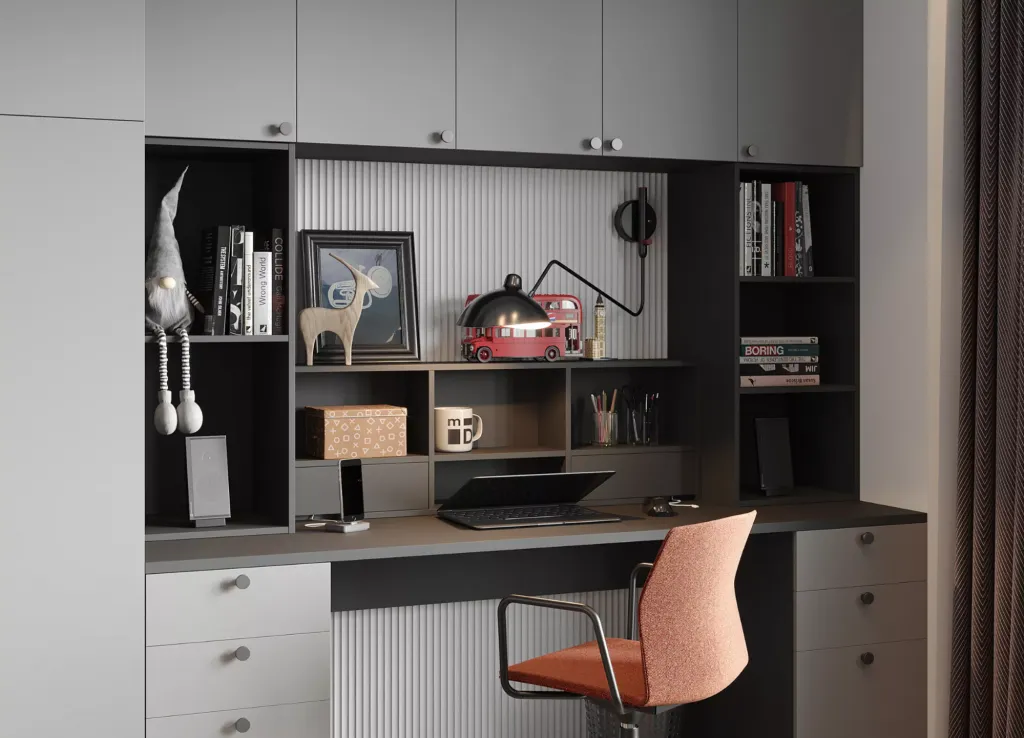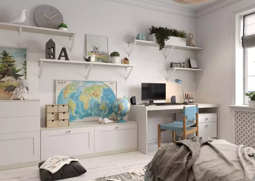Как правило, эту зону объединяют с зоной хобби. Для неё требуется качественный письменный или компьютерный стол, достаточно просторный, чтобы кроме монитора или ноутбука на нём поместился ещё и планшет, осталось место для рабочих тетрадей и учебников. Важно хорошо подобрать освещение или выбрать место для стола рядом с окном.