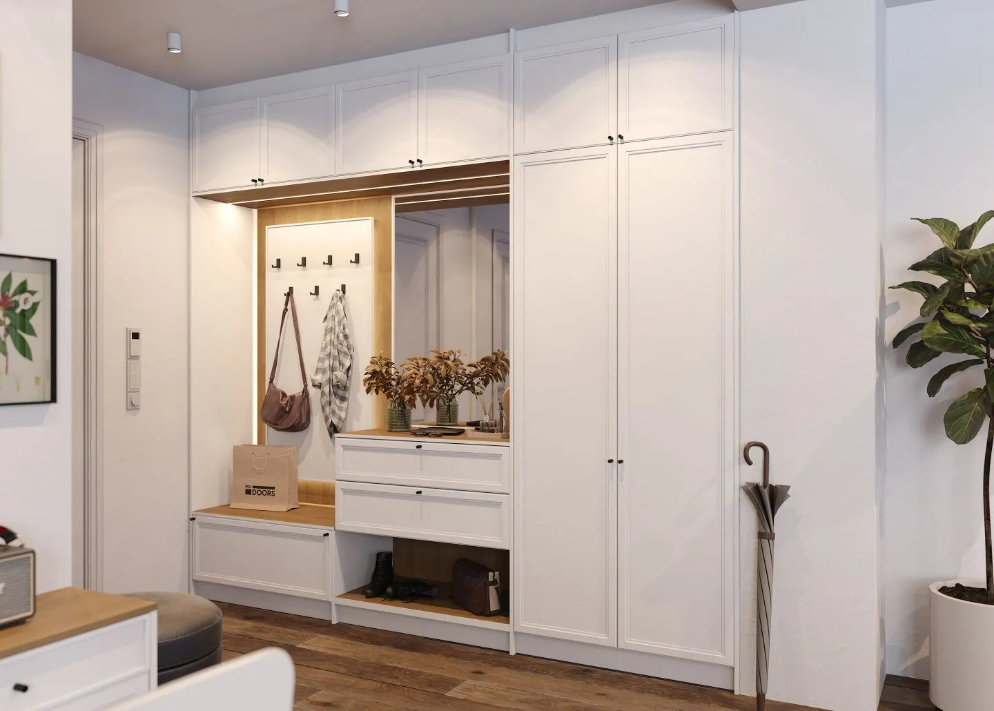 Существует множество интересных дополнительных предметов мебели для прихожей. Если вам позволяет место, вы можете поместить в ней декоративную ключницу, подставку для зонтов или тростей. В моде специальные шкафчики для обуви и подставки для шляп.