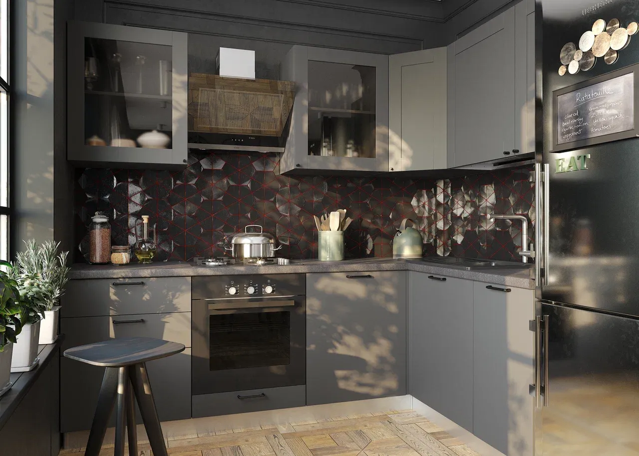Фартуки для кухни из мозаики с геометрическим узором. При этом, они должны быть выполнены в нейтральной гамме и хорошо освещены.