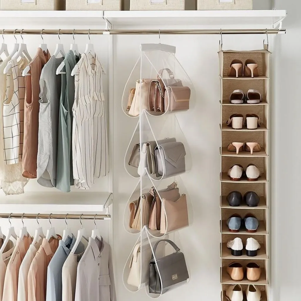 Сумки и обувь обязательно имеют в шкафу свои места. Как красиво разложить эти вещи в шкафу? Для сапог и туфель выделяются самые нижние полки. Для сумок и шляп выделяются самые верхние. Чтобы длинные сапоги не теряли форму, их можно подвешивать на плечиках с зажимами, поместив в шкаф небольшую штангу. Чтобы сумки не мялись, их можно набить бумагой или положить в них те самые старые и редко используемые вещи, о которых говорилось выше. Небольшие сумочки и клатчи можно определить в яркие текстильные боксы и расставить их на видном месте.