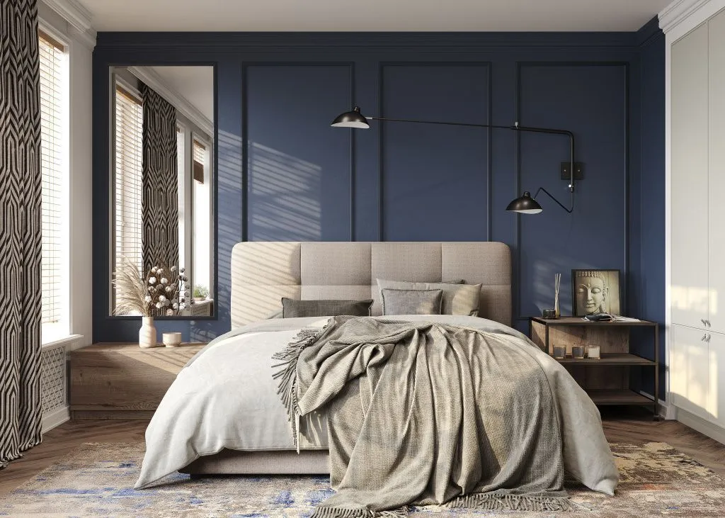 Напротив, тёплые цвета, вроде бежевого, серого или коричневого, сделают интерьер уютным. Подойдут и холодные оттенки, к примеру, голубой или зелёный. Такие цвета дополнят оформление спальни и создадут атмосферу уюта. А слишком яркие и контрастные цвета не подходят для спокойного отдыха.