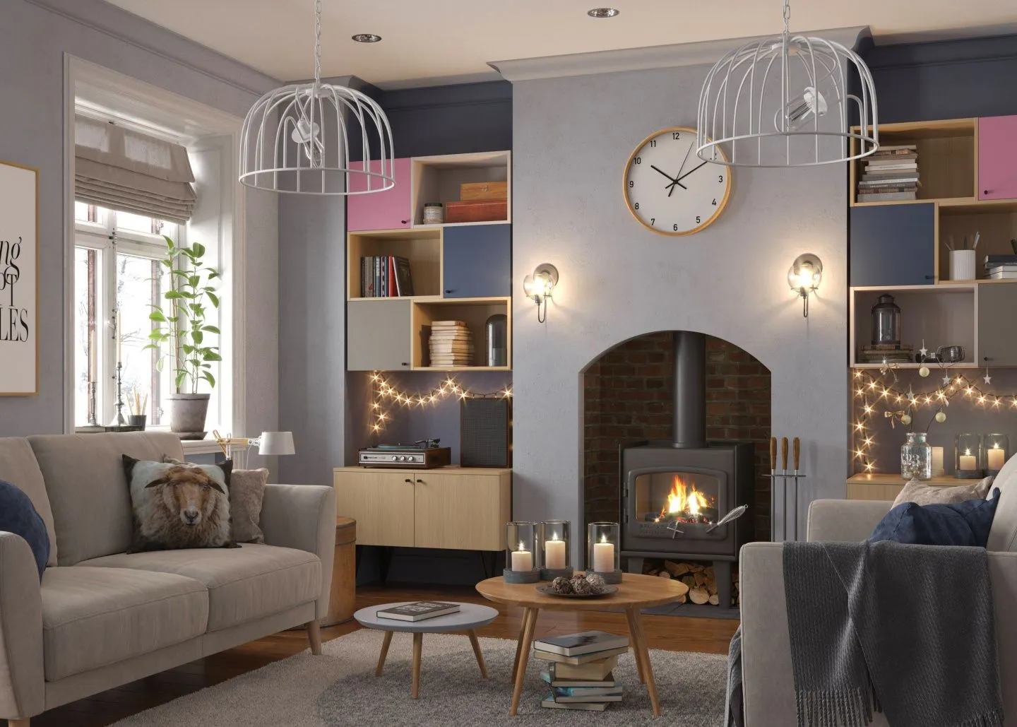 Выделить стол можно при помощи освещения. Для гостиной можно использовать небольшие точечные светильники, а над обеденной зоной повестить люстру, подходящую под стиль интерьера помещения.