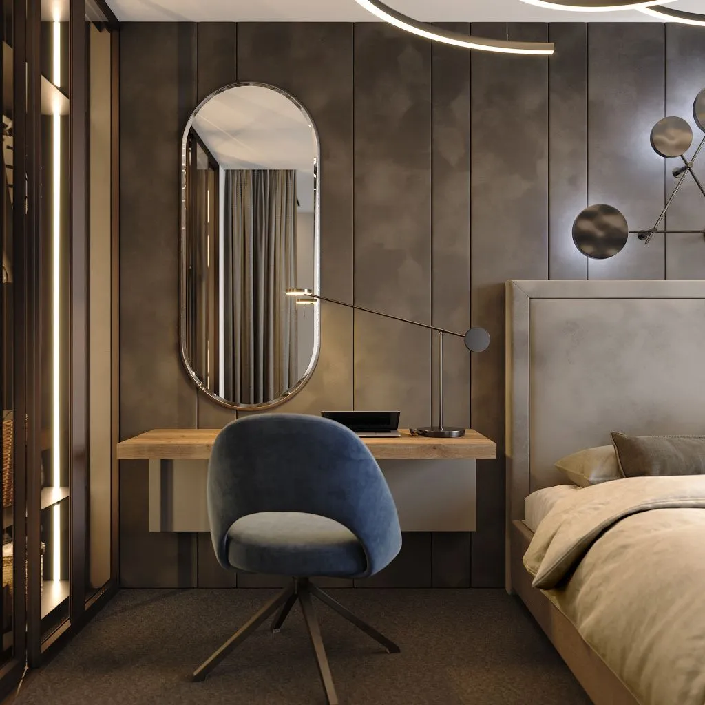 Спальни, как правило, дополняются туалетным столиком с вмонтированным или съемным зеркалом на нем. При возможности зеркало можно переместить в наиболее комфортное место.