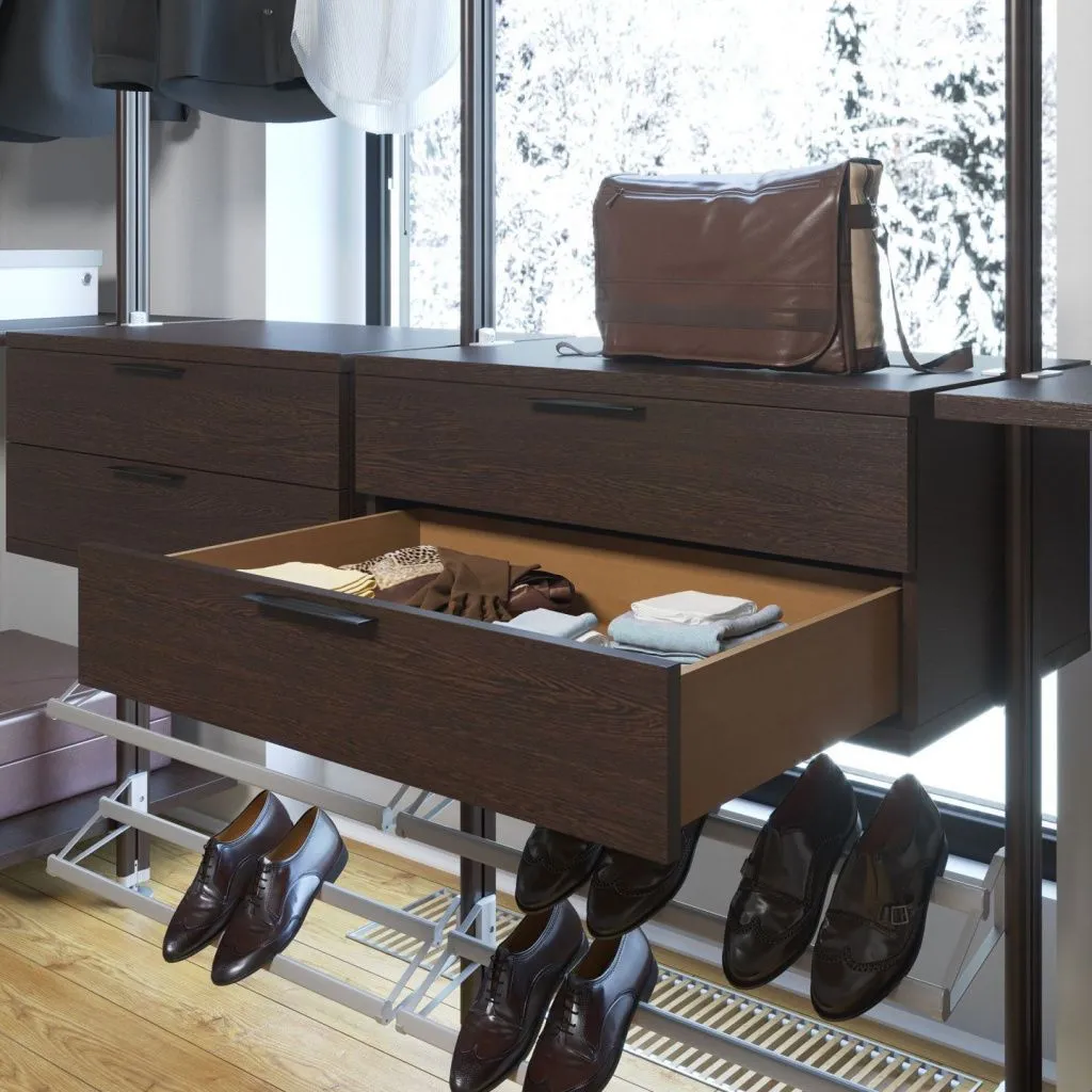 Пространство под лестницей является идеальным местом, где лучше расположить гардеробную в двухэтажном доме. При разумном подходе здесь легко можно организовать хранение различных вещей. Для такого варианта используйте распашные двери или продумайте возможность установки открытых стеллажей. Хранение мелких вещей в пластиковых или текстильных корзинах способствует поддержанию порядка и облегчает поиск нужных предметов.