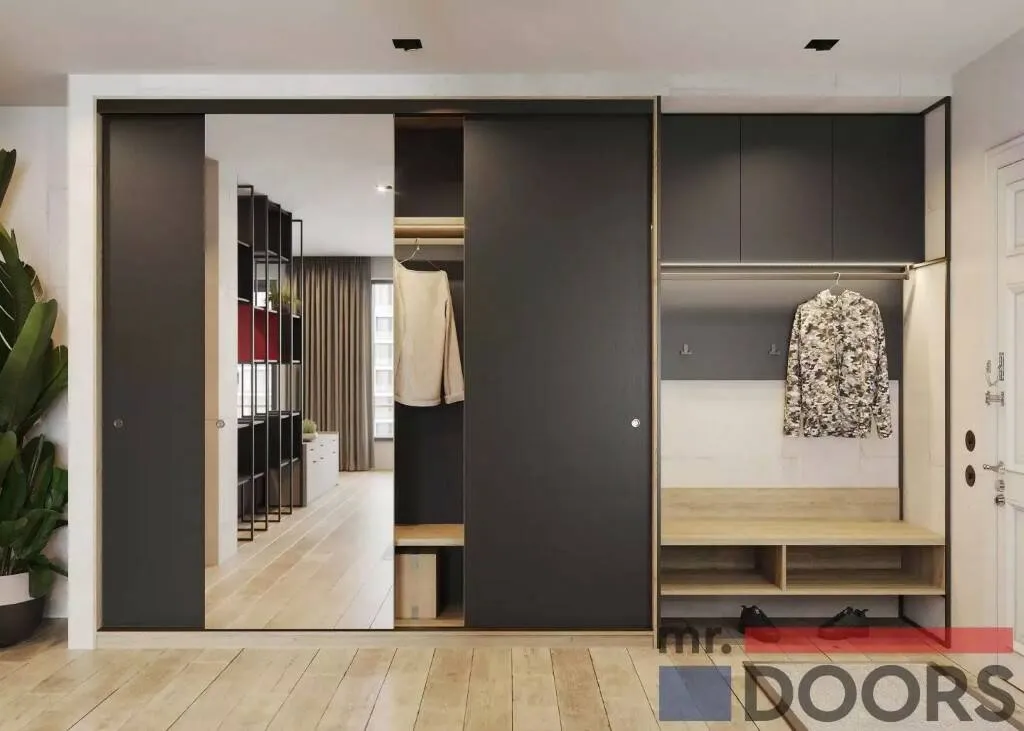 Где расположить гардеробную, как не в коридоре? При наличии просторной прихожей, можно отделить небольшую ее часть для организации гардеробной. В этом случае целесообразней установить двери-купе, чтобы можно было сэкономить пространство.