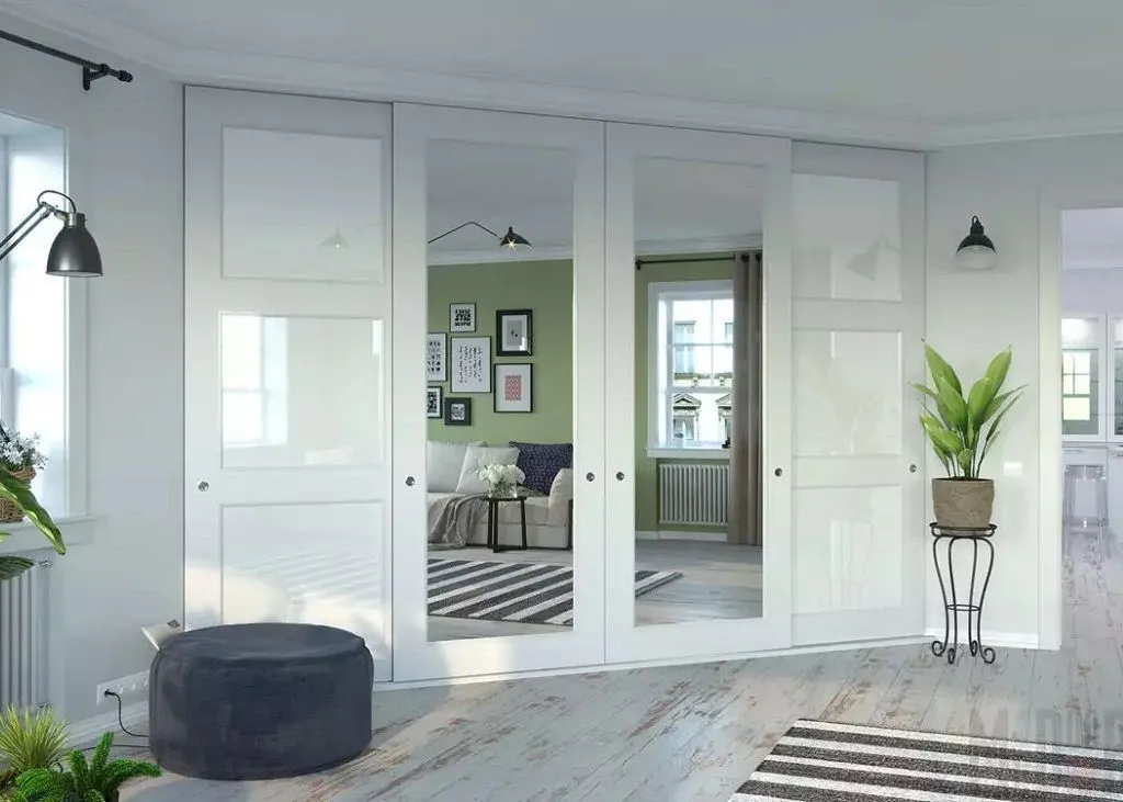Если вы только планируете строительство коттеджа за городом, то обязательно предусмотрите отдельную комнату для гардероба. Как правило, его располагают рядом со спальней. Хорошим вариантом станет совмещение гардеробной со спальней. Это сэкономит время, необходимое на сборы. Двери при наличии достаточного пространства, могут быть распашные, раздвижные или складные.