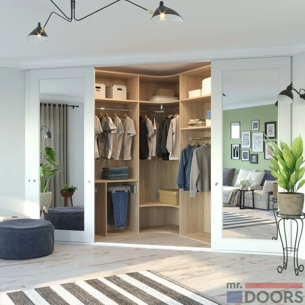 - Установка дверей. Отмерьте место, где они будут располагаться. Например, отступите от каркаса шкафа на 60 см или 100 см. Такое расстояние позволит комфортно перемещаться внутри, даже при закрытых дверях. Конечно же, распашные и раздвижные двери тоже можно смонтировать самостоятельно, но лучше доверить эту часть работ специалистам.