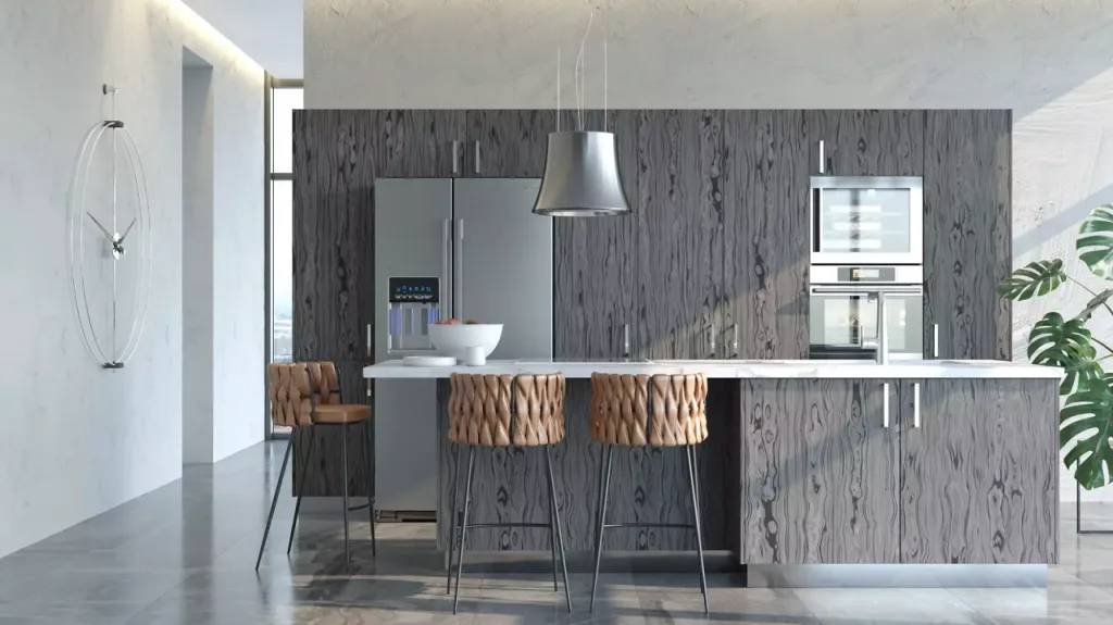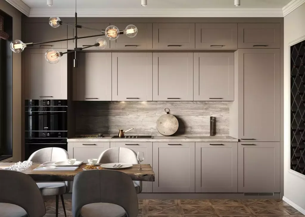 Популярное решение, которое подойдет для кухни любого размера и планировки, как совмещенной с гостиной, так и отдельной. Выбор техники может представлять определенную сложность, поэтому в большинстве случаев для такой кухни удачным решением будет встроенная техника.