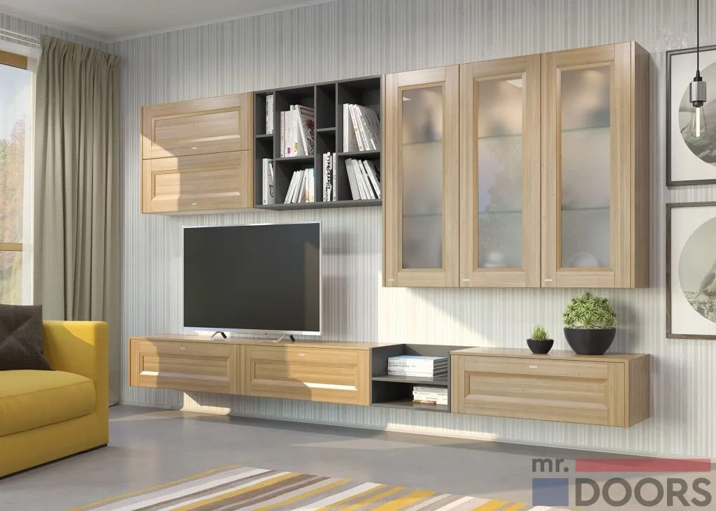 Как свидетельствует фото стенок классика, они включают несколько секций. Каждый отдел обладает своим назначением. Чаще всего это шкафы, тумбочки, полки, бар, отсек для телевизора. Гарнитур может быть застекленным или закрытым, а также одно-, двустворчатым. Отличаются и двери – бывают распашными и раздвижными. Благодаря большому ассортименту для любого интерьера можно найти оптимальный вариант.