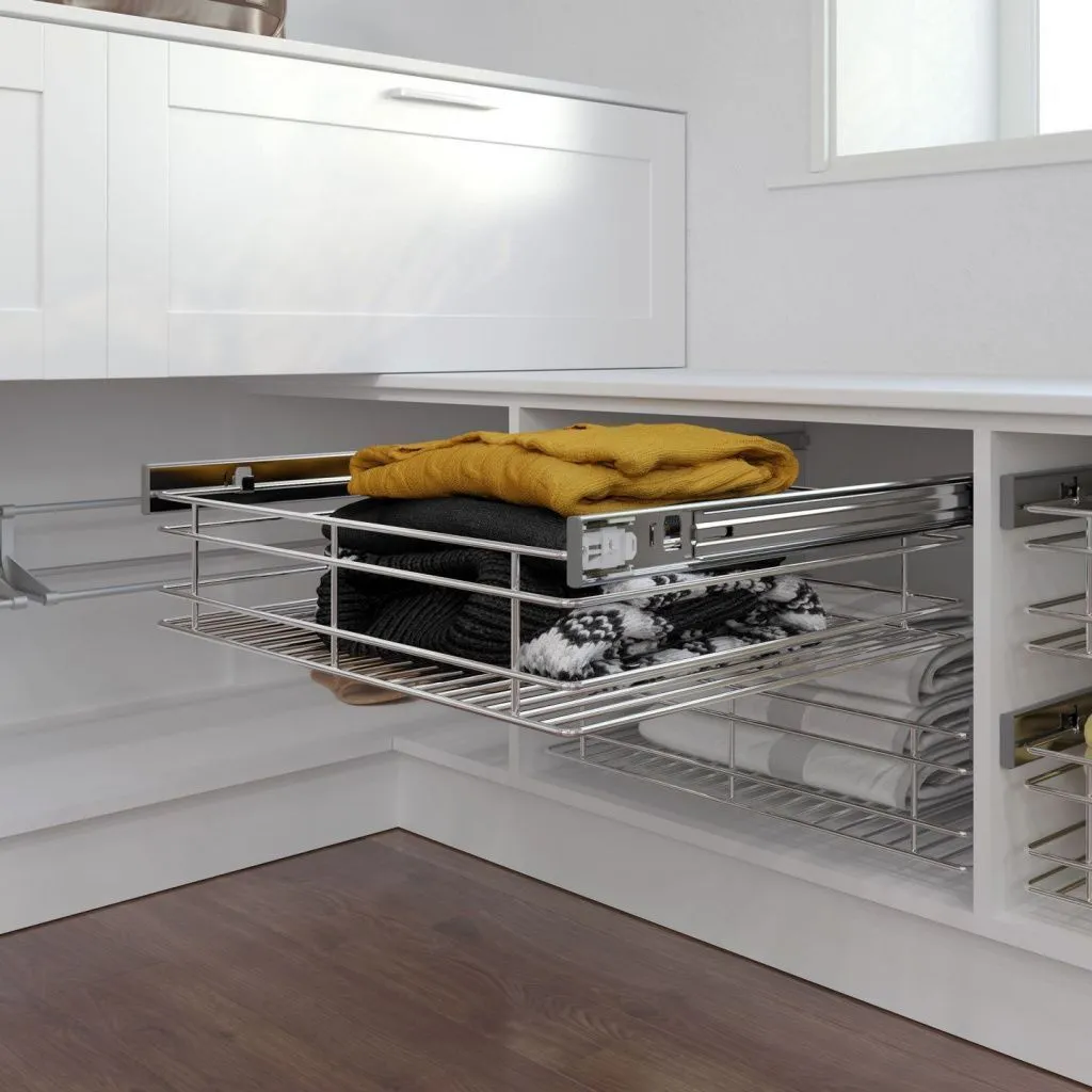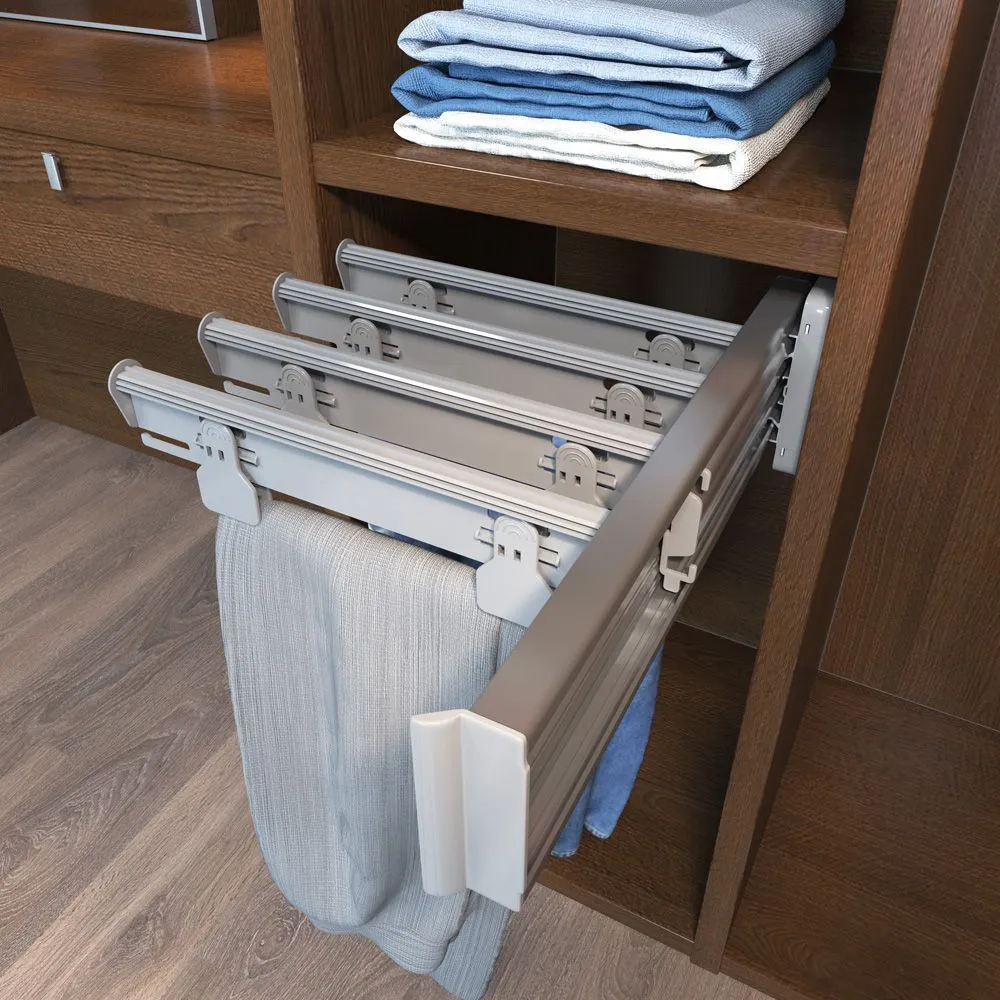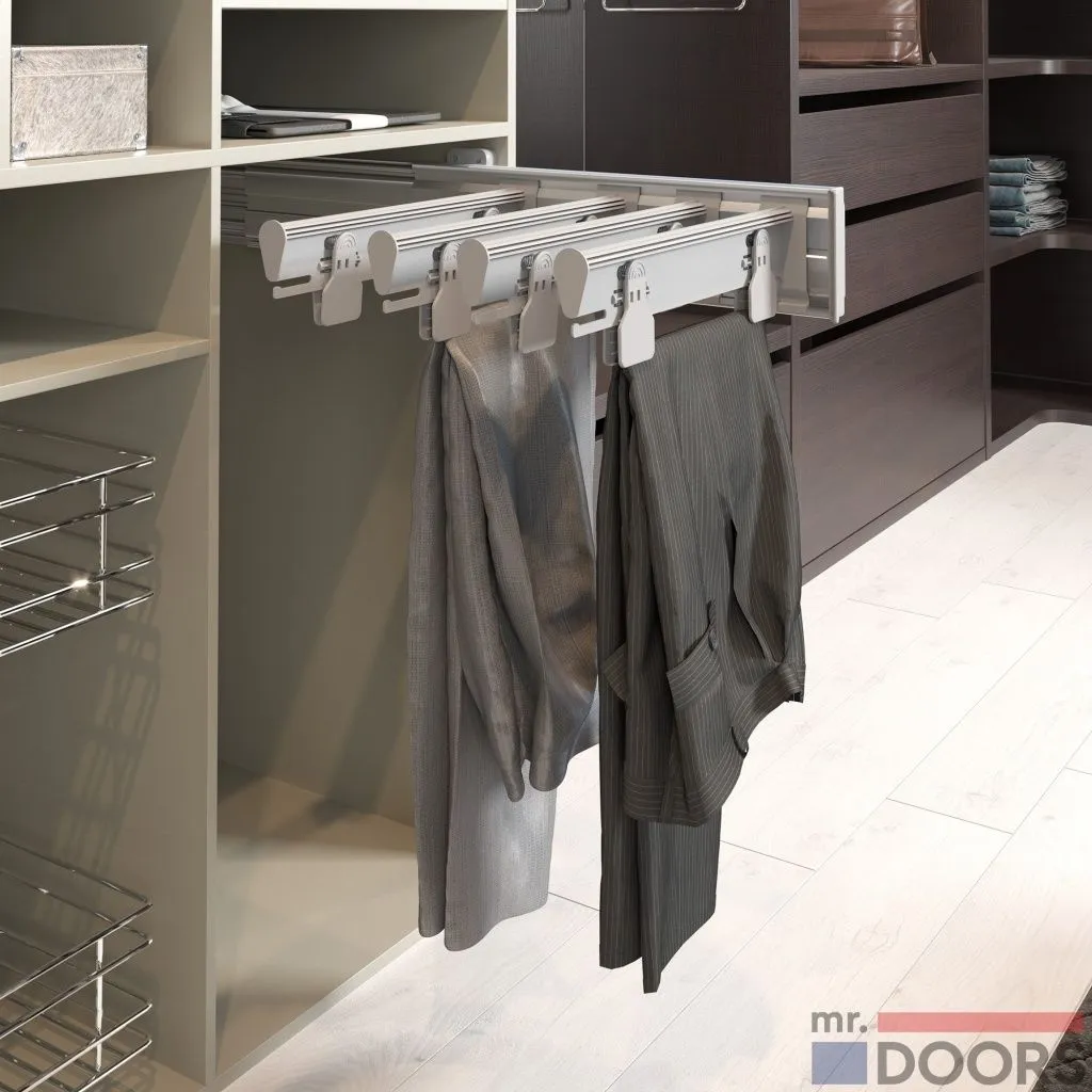 Выдвижная решетка для брюк серии «Хромос» имеет надежный механизм крепления к верхней полке и удобную систему выдвижения