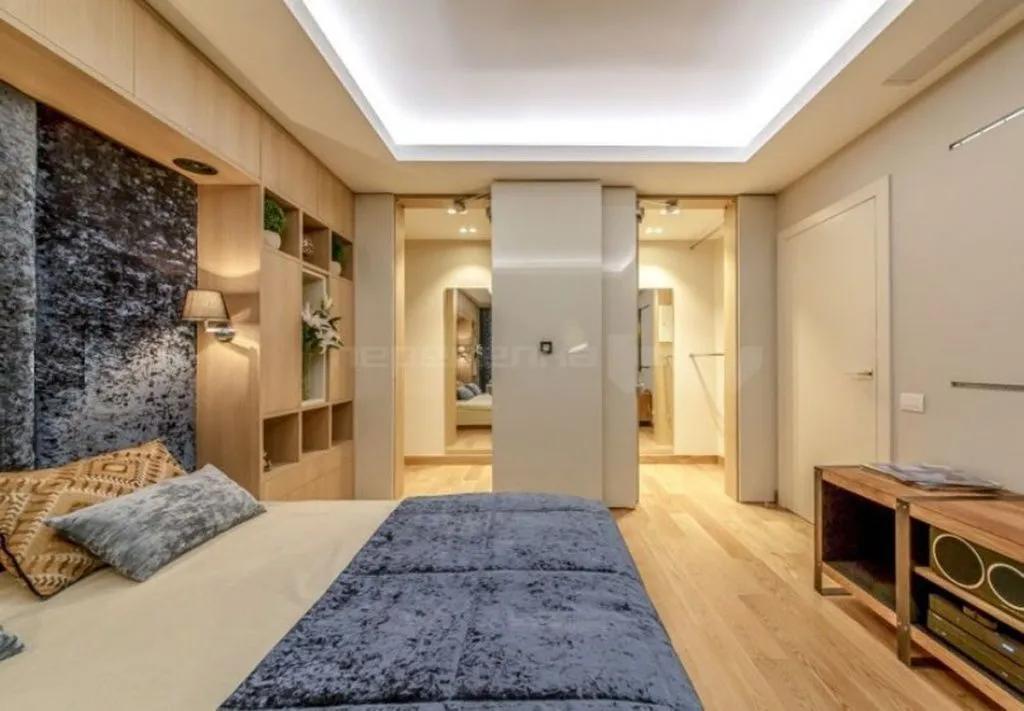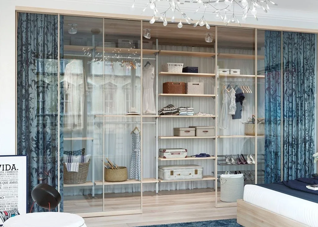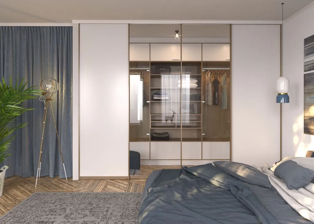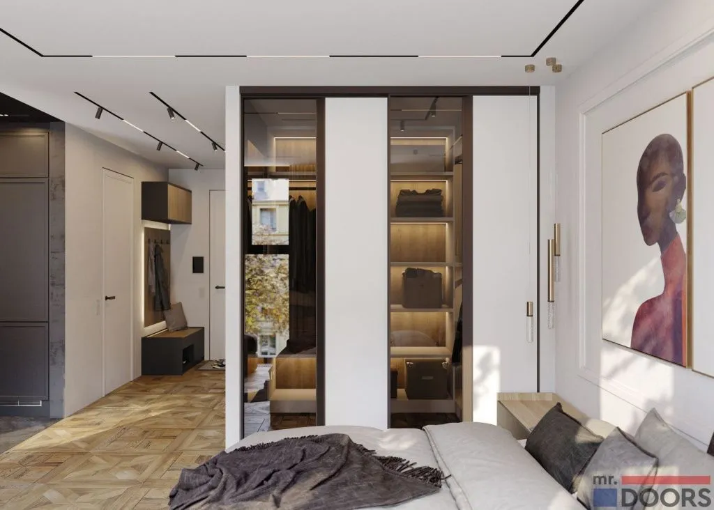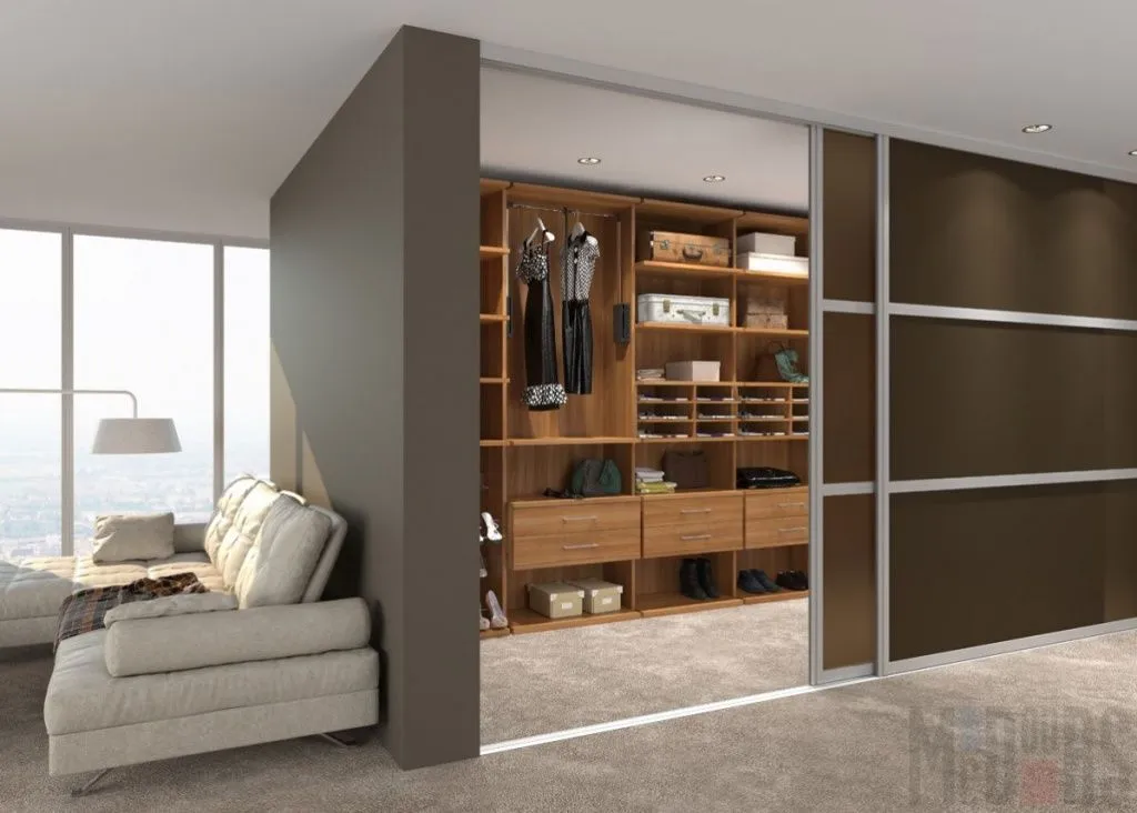 маленькая гардеробная уже предусмотрена планировкой. Однако если в вашем жилище изначально отсутствует отдельное помещение для хранения вещей, вы можете создать его самостоятельно, отделив часть комнаты стационарной или раздвижной перегородкой.