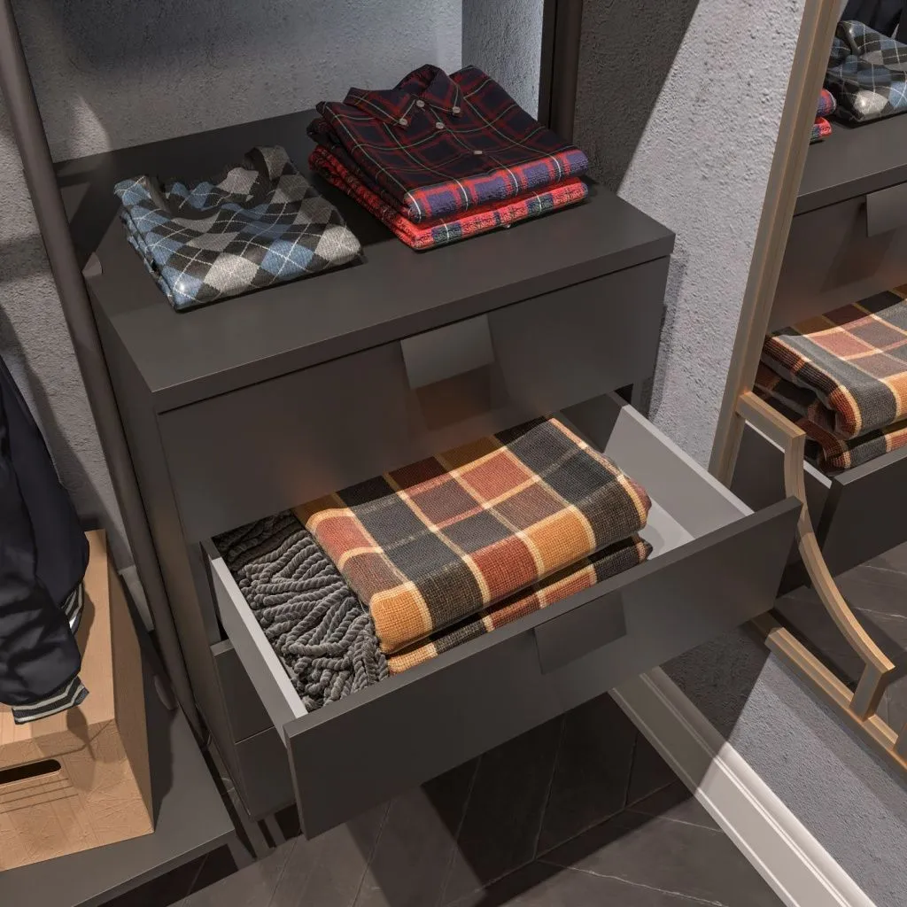 Рамный модуль для крепления выдвижных корзин увеличивает мобильность вашей гардеробной. Вы можете без проблем передвинуть его на удобное для вас место в любое время
