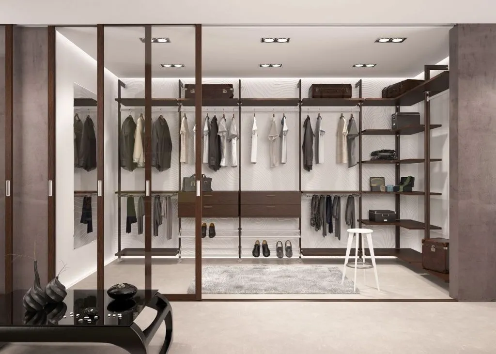 - Линейные. Внутреннее наполнение в них располагается вдоль одной стены. Такая гардеробная напоминает глубокий шкаф-купе и зачастую отделяется от основного объема комнаты с помощью передвижных перегородок.