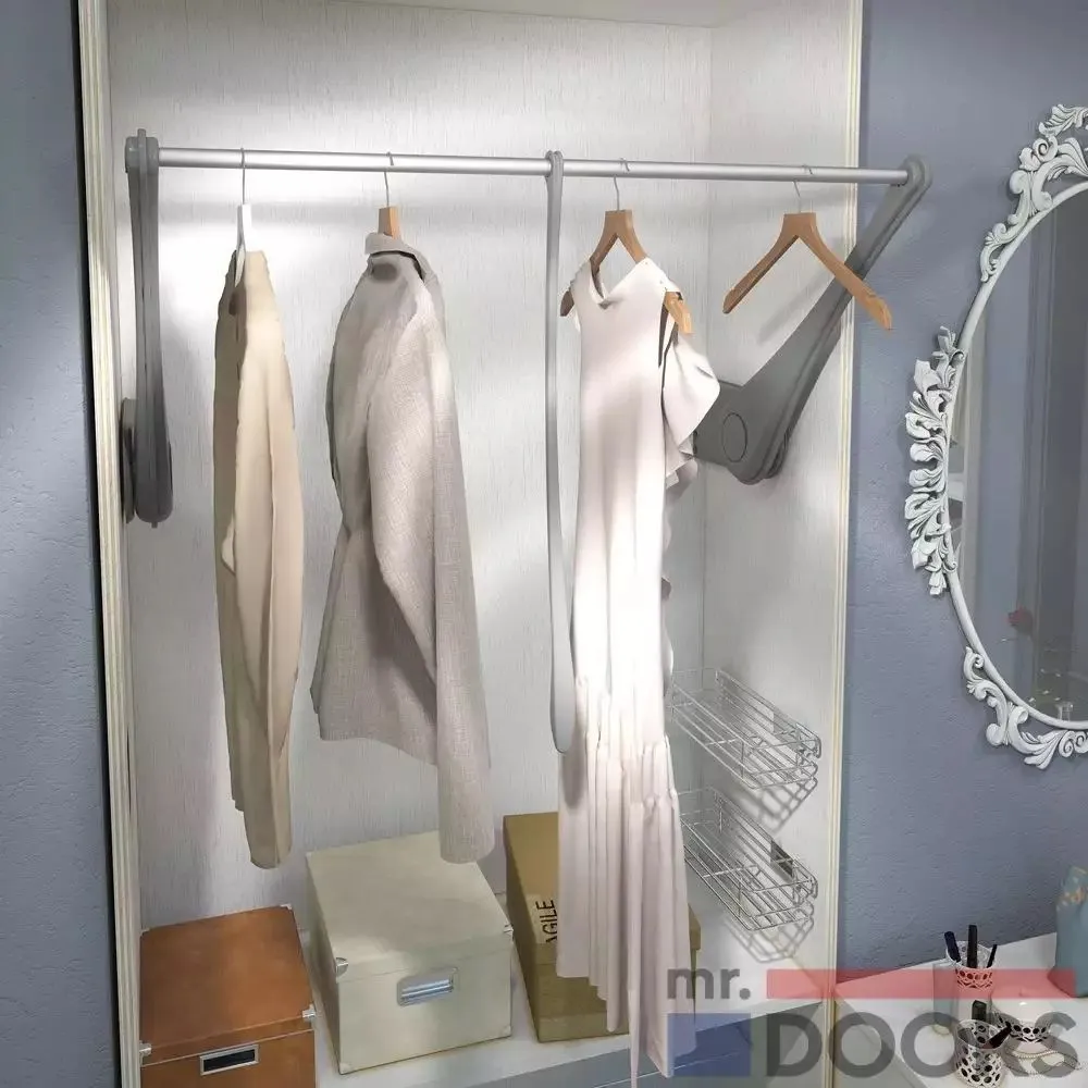 Вешало-лифт прекрасно впишется в интерьер маленькой гардеробной, увеличив площадь хранения постоянно используемых предметов одежды
